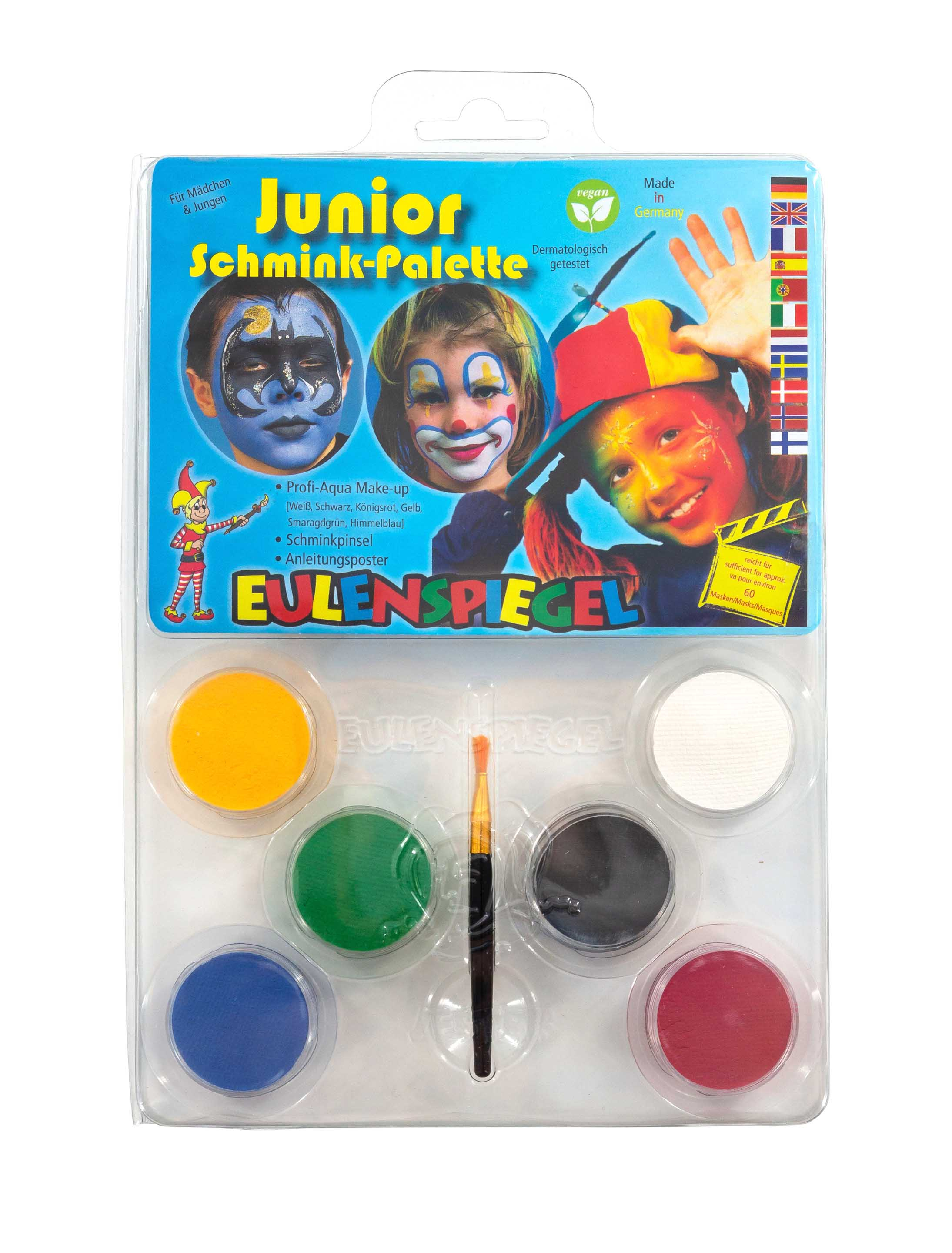 Der ideale Schminkkasten von Eulenspiegel für Kinder. Mit den 6 Farben (Weiß, Schwarz, Königsrot, Gelb, Smaragdgrün, Himmelblau) lassen sich vielerlei Motive schminken. Und solltet ihr Schwierigkeiten haben, so wird Euch mit der beiliegenden Anleitung in einer Schritt-für-Schritt-Darstellung beim Schminken geholfen. Lasst Euch zu Karneval und Fasching als Clown, Cowboy oder Pirat schminken und zu Halloween als Fledermaus, Frankenstein oder gruseligen Clown. Das wird ein Spaß! Die 6 Farben-Palette reicht für circa 60 Masken. Der Kasten besteht aus sechs Eulenspiegel-Farben (á 3,5 ml), einem Pinsel sowie einer vollständigen Anleitung in Schritt-für-Schritt-Darstellung für die jeweiligen Motive. Der Junior Schminkkasten für Jungen und Mädchen beinhaltet die Farben Weiß, Schwarz, Königsrot, Gelb, Smaragdgrün und Himmelblau.