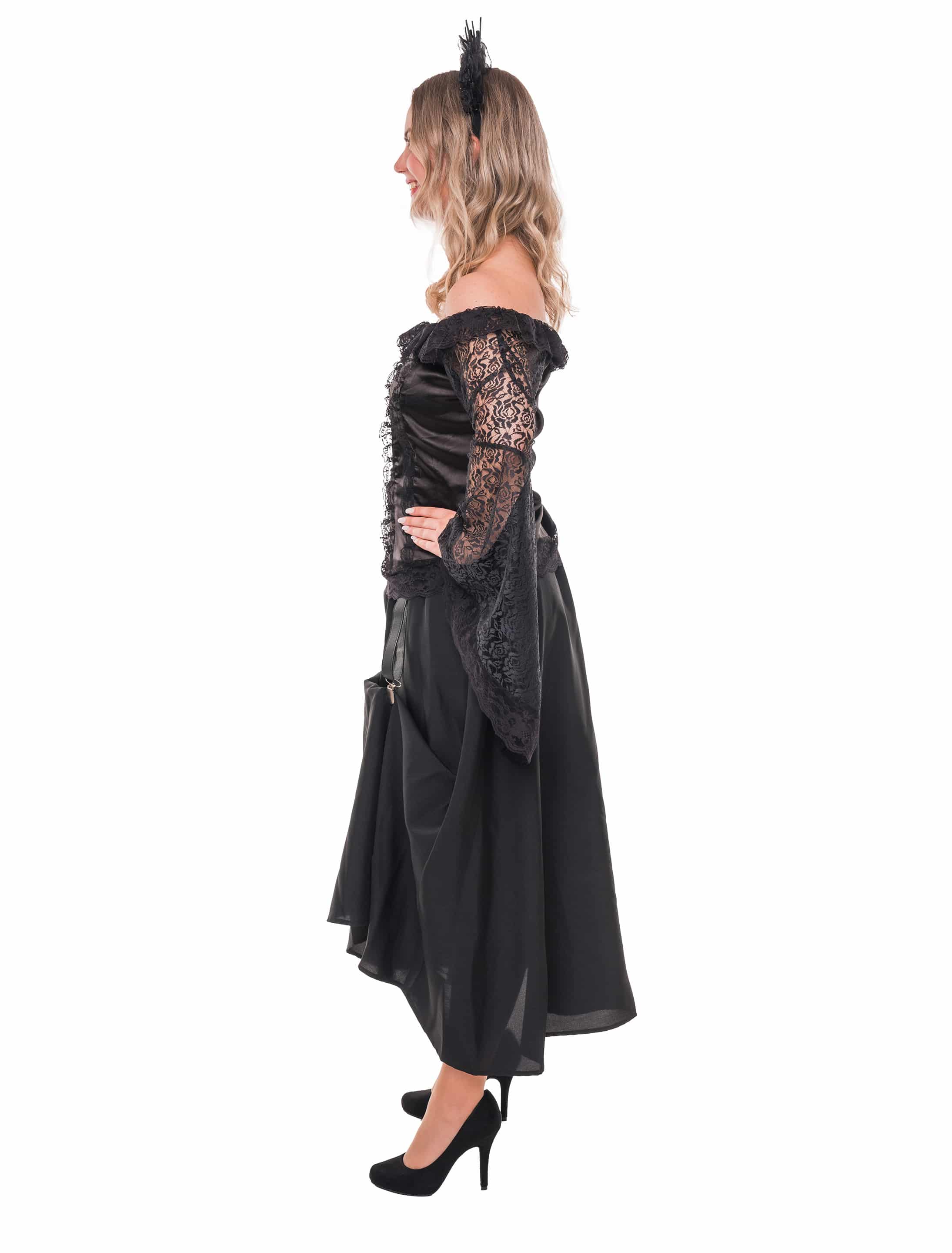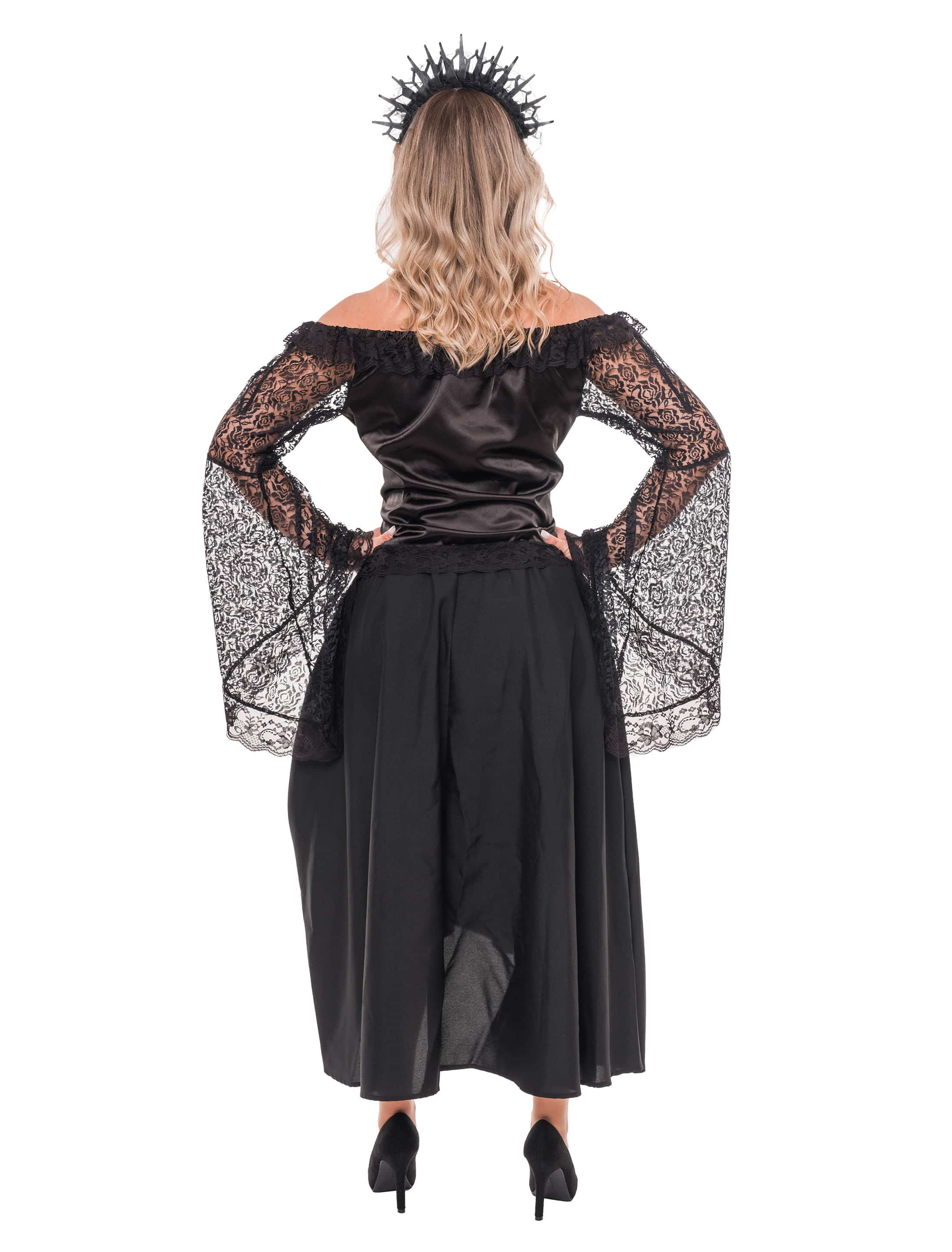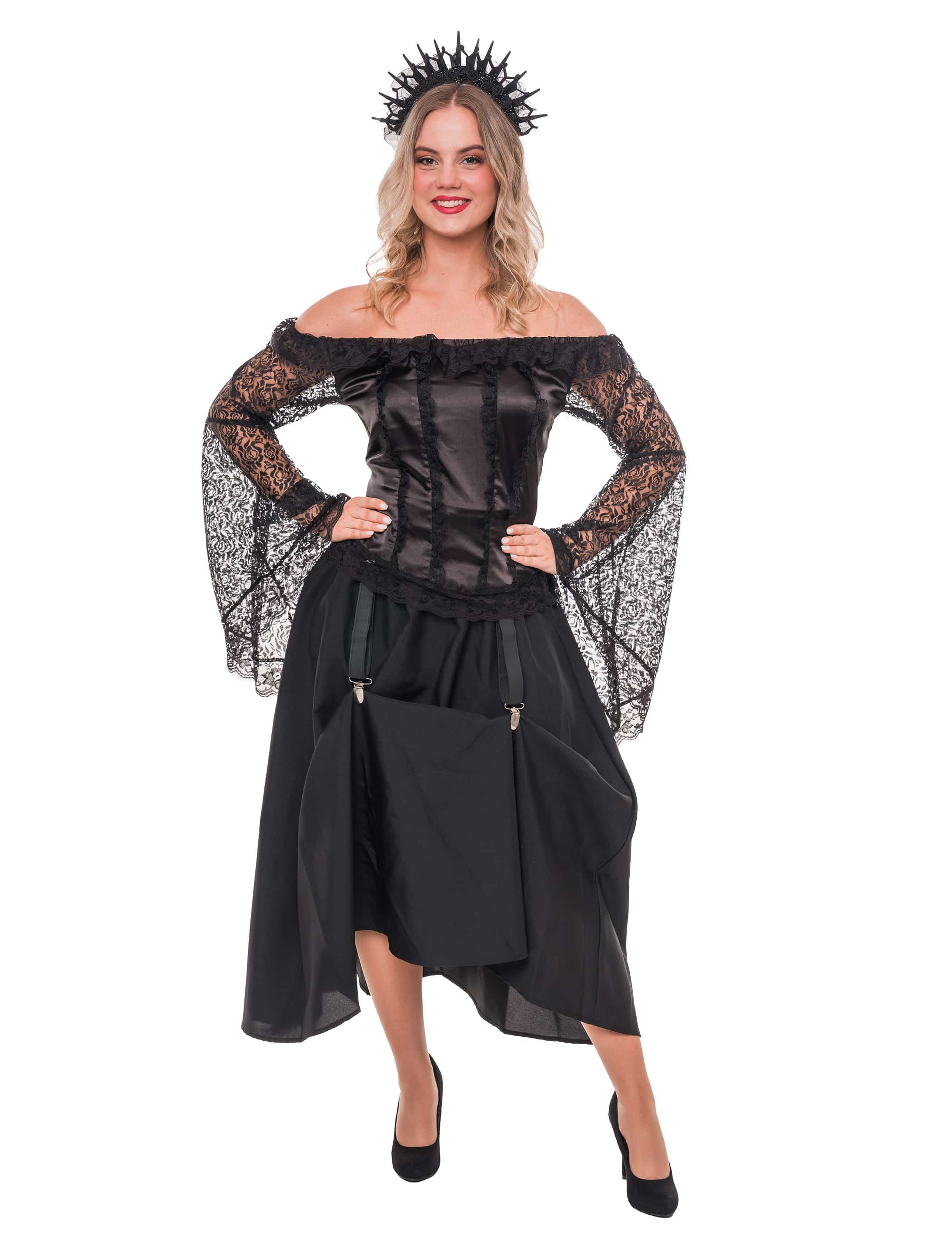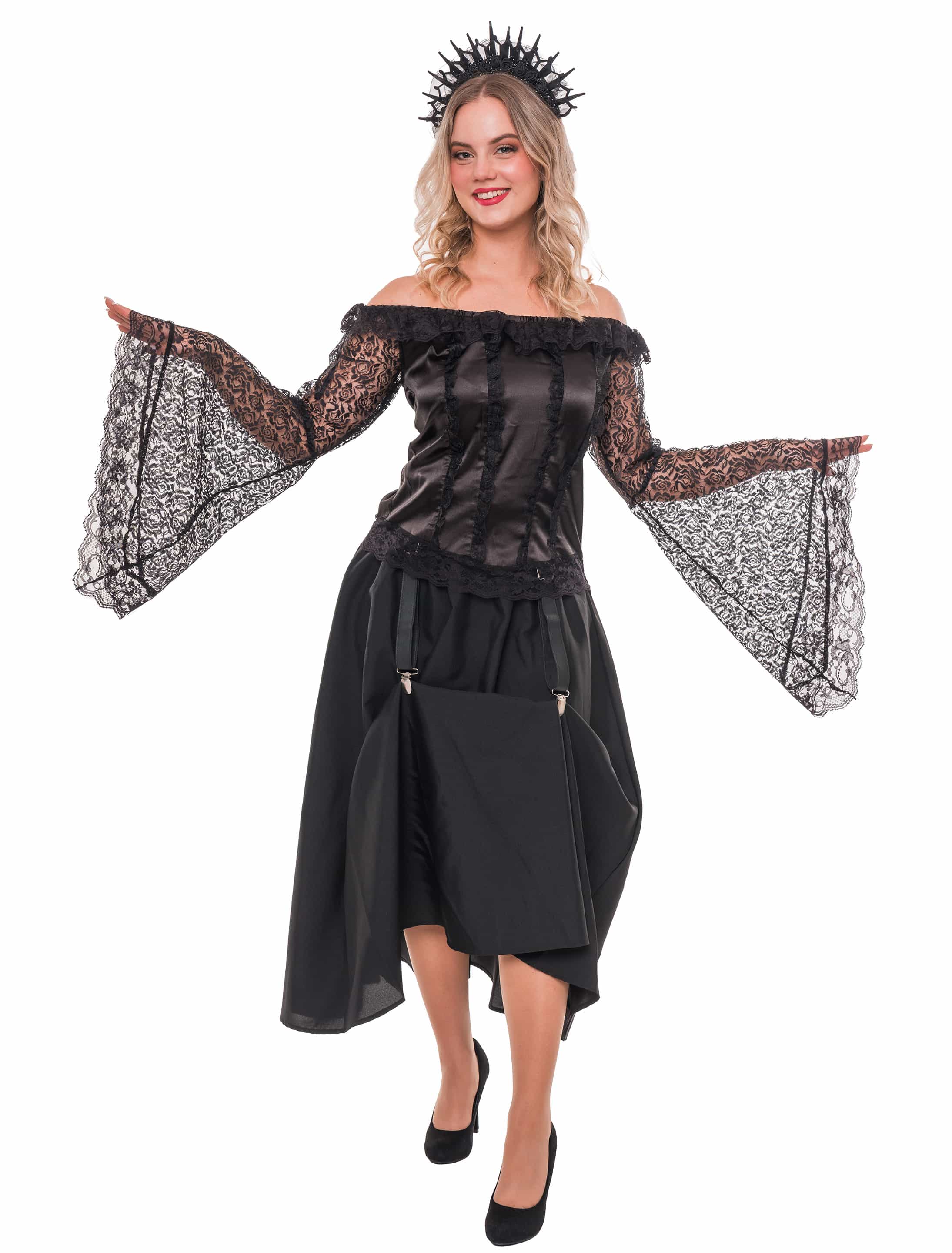 Unsere schulterfreie Spitzenbluse vereint düsteren Charme mit eleganter Raffinesse – perfekt für Kostüme mit einem Hauch von Magie und Mystik. Die weiten Ärmel aus zarter Spitze verleihen dem Look eine dramatische Note, während das transparente Design bei jeder Bewegung für einen geheimnisvollen Effekt sorgt. Ein besonderes Highlight ist der Kreuzanhänger am Dekolleté, der das Gesamtbild stilvoll abrundet. Ideal für Vampir-, Gothic- oder Hexen-Outfits – mit dieser Bluse wird jeder Auftritt zum Blickfang auf der nächsten Kostümparty!