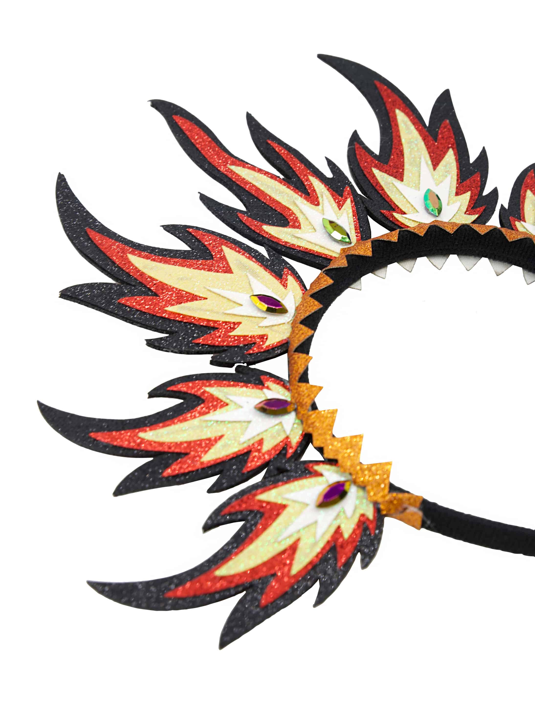 Ein echter Hingucker für alle, die mit ihrem Look ein Statement setzen wollen! Unser Haarreif ist rundum mit auffälligen Flammen verziert, die sowohl vorne als auch hinten sichtbar sind. Jede einzelne Flamme ist kunstvoll gestaltet und mittig mit einem glänzenden Strassstein besetzt, was dem Accessoire einen besonders edlen Touch verleiht. Ob für Karneval, Festivals oder außergewöhnliche Mottopartys – mit diesem Haarreif ziehst du garantiert alle Blicke auf dich!