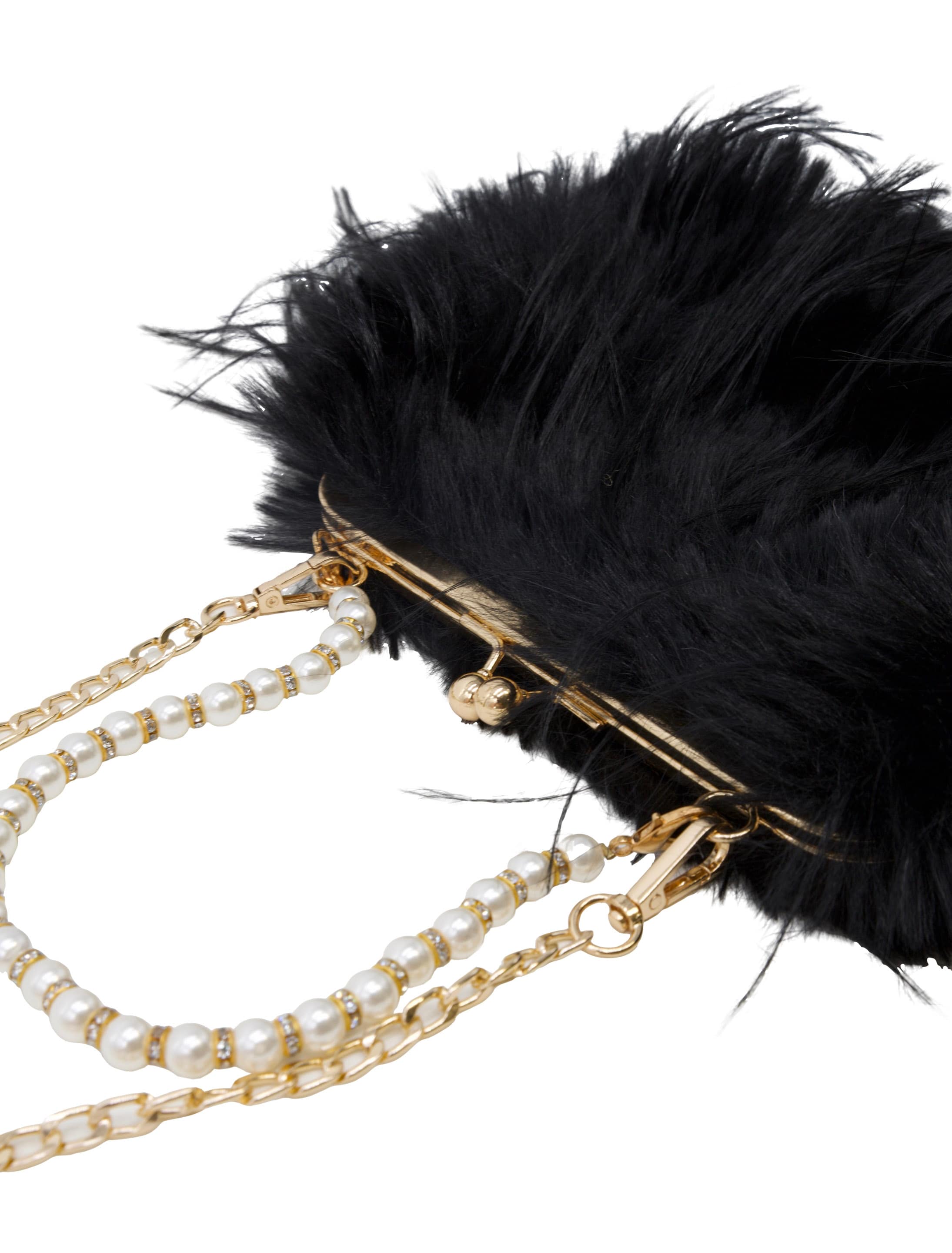 Diese flauschige Handtasche aus schwarzem Kunstfell wird durch eine elegante Perlenkette und goldene Gliederkette zum absoluten Hingucker. Perfekt für glamouröse Outfits bei Karneval, Partys oder besonderen Anlässen. Leicht und angenehm zu tragen.