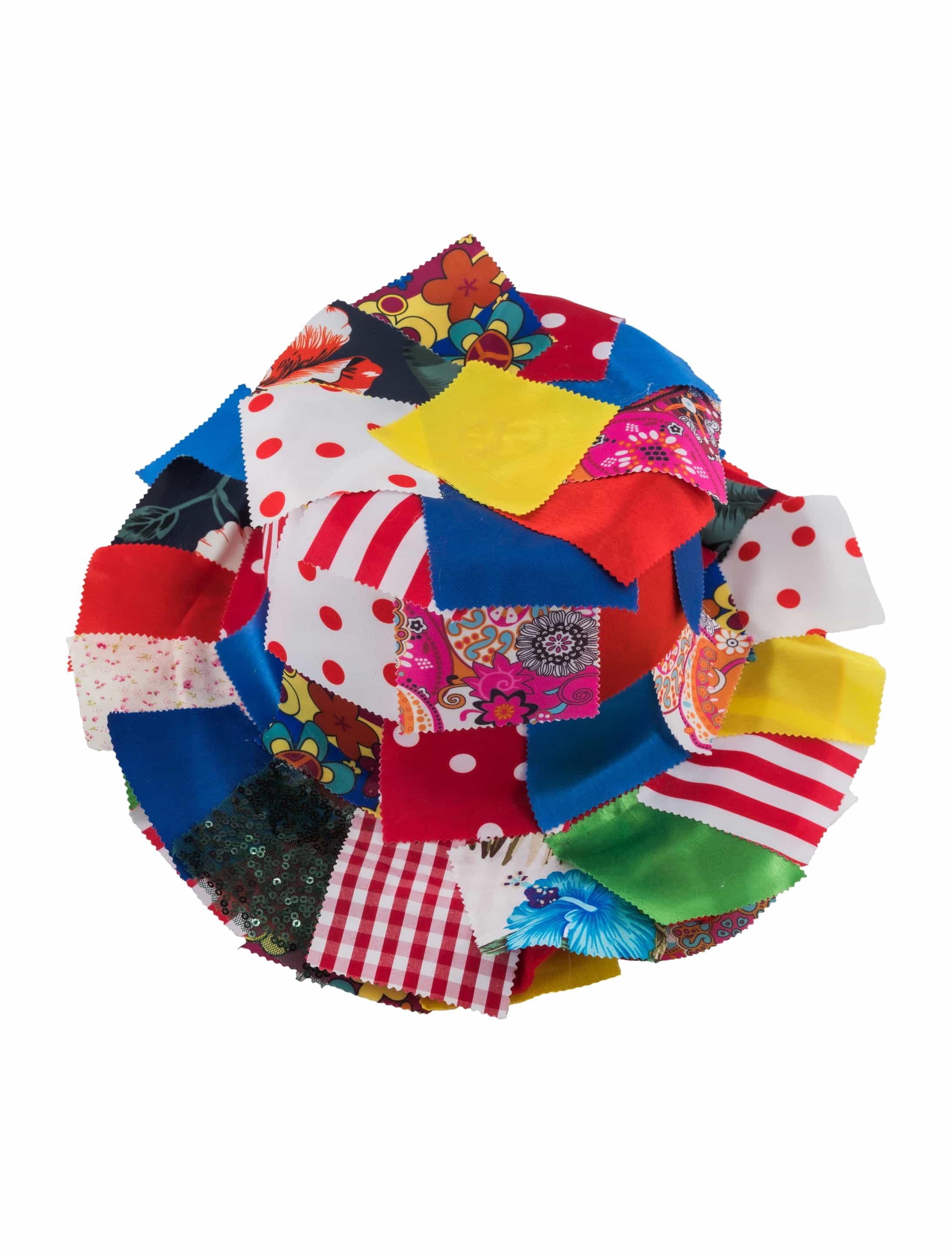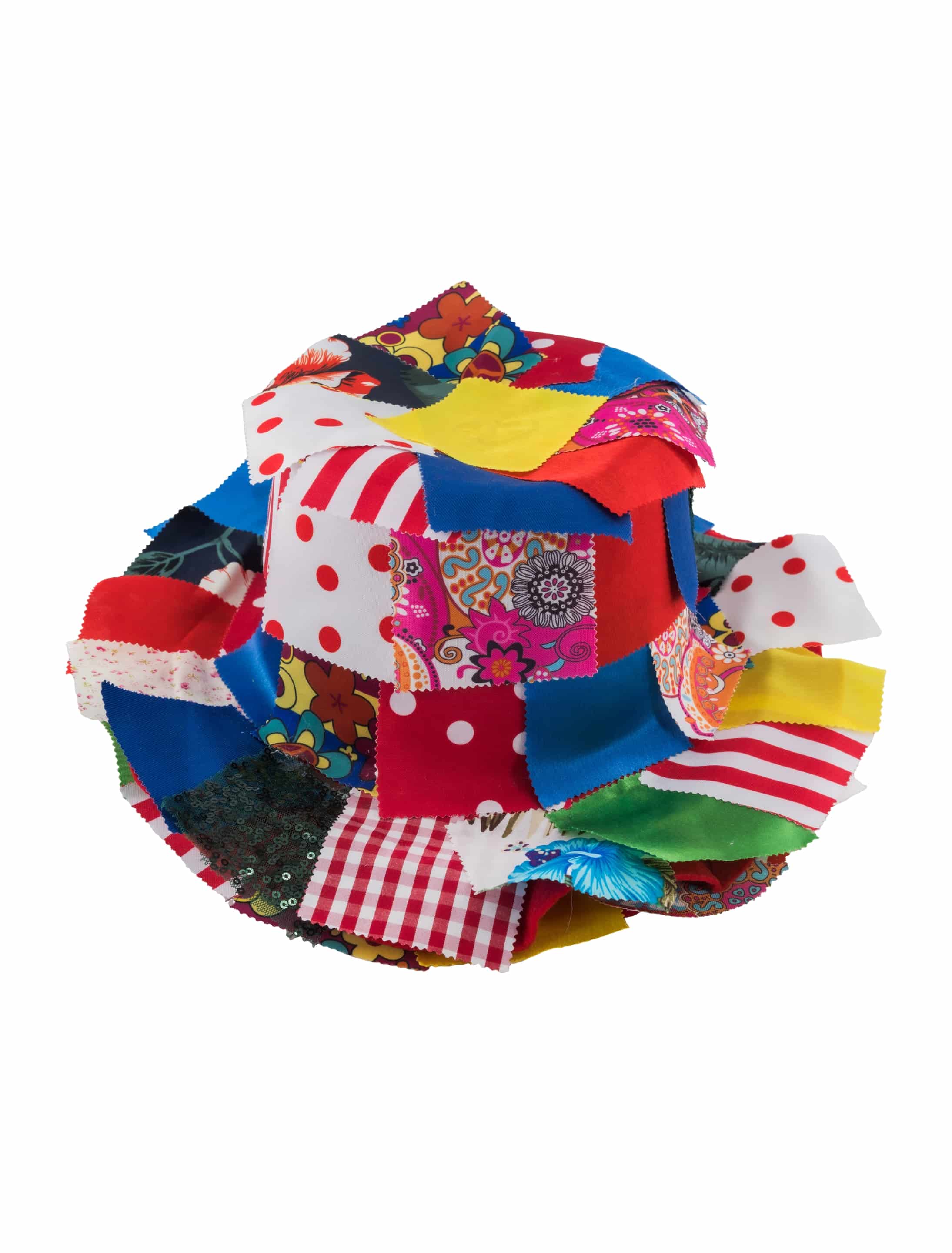 Dieser farbenfrohe Hut im Patchwork-Look ist rundum mit bunten Stofflappen verziert und sorgt für echte Clowns- oder Spaßmacher-Vibes. Jeder Hut ist ein Unikat, da die Stoffkombinationen immer einzigartig ausfallen. Leicht, bequem und ein echter Hingucker für Karneval, Zirkus-Mottopartys oder bunte Umzüge – sowohl für Damen als auch Herren geeignet.