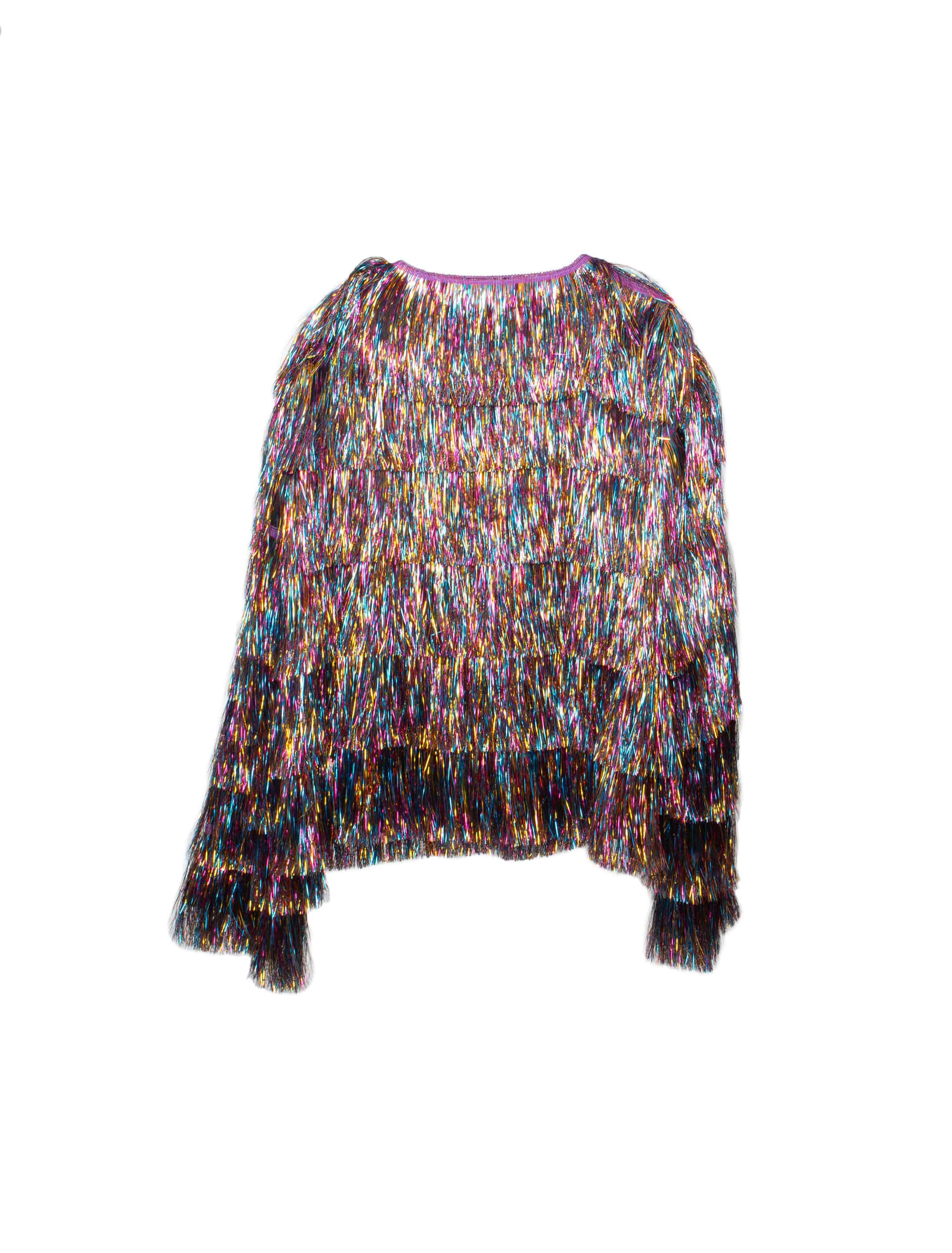 Mit unserer feinen Lametta Jacke für Damen bist du der funkelnde Mittelpunkt jeder Party! Diese außergewöhnliche Jacke ist gemacht für große Auftritte – glänzend, auffällig und voller Bewegung. Die langärmelige Jacke ist von oben bis unten in mehreren Lagen schimmerndem Lametta eingehüllt. Die feinen, glänzenden Streifen tanzen bei jeder Bewegung mit und erzeugen einen lebendigen, glitzernden Effekt, der garantiert für Aufmerksamkeit sorgt. Ob als Highlight fürs Festival, Karneval, die Bühne oder jede andere Gelegenheit, bei der du glänzen willst – mit dieser Jacke bist du bestens ausgestattet!