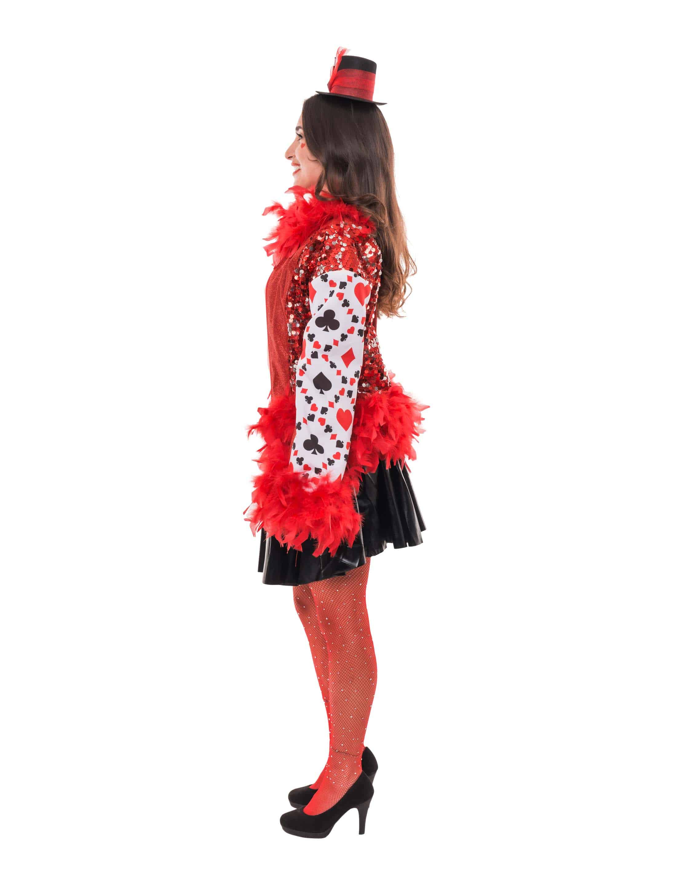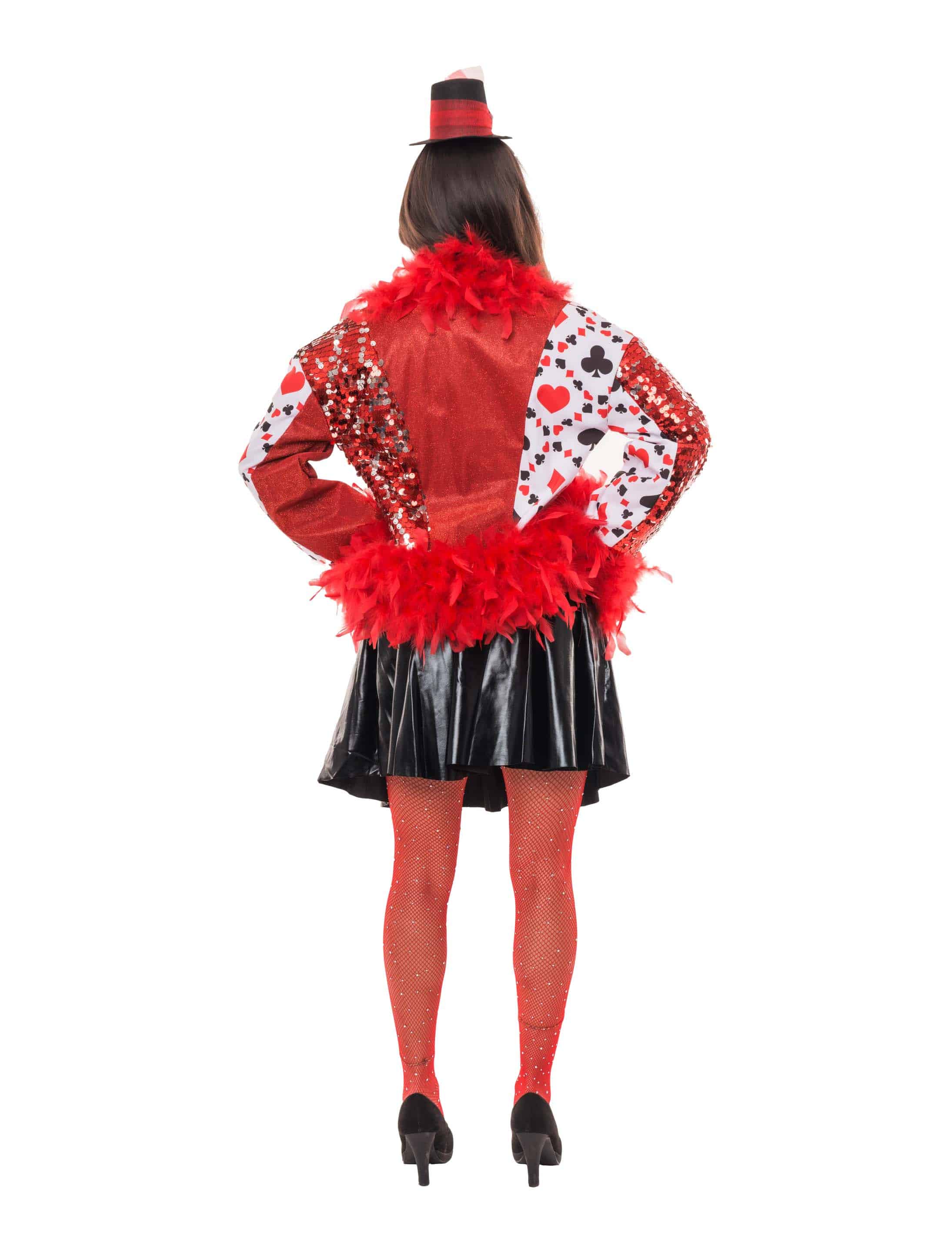 Unsere Jacke Spielkarten mit Federn ist ein echtes Statement-Piece für auffällige Auftritte. Vorne lässt sie sich bequem mit einem Reißverschluss schließen, doch das Highlight steckt im Design: Die Jacke vereint verschiedene Muster und Stoffe zu einem spektakulären Gesamtbild. Federn, Pailletten, Spielkartensymbole und Glitzerstoff harmonieren farblich perfekt miteinander und machen die Jacke zu einem einzigartigen Hingucker. Ob Karneval, Festival oder Mottoparty – mit unserer Spielkartenjacke zeigst du Mut zum Mix und sorgst garantiert für Wow-Momente!