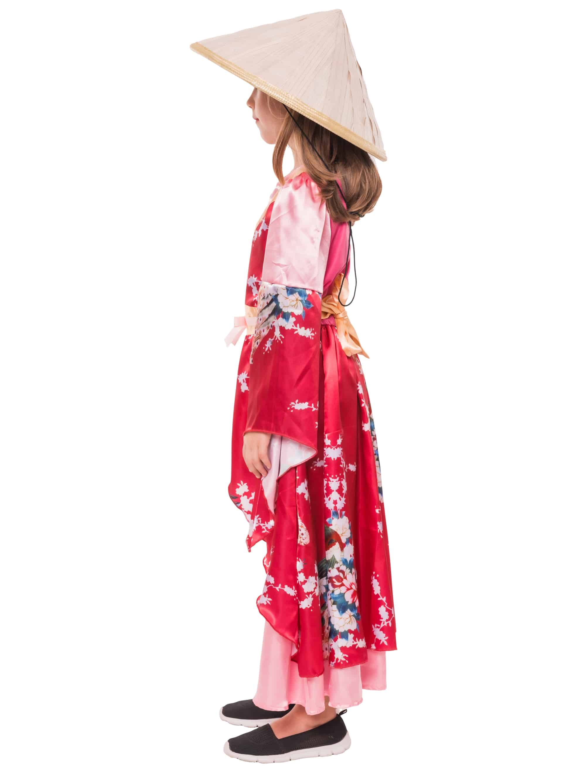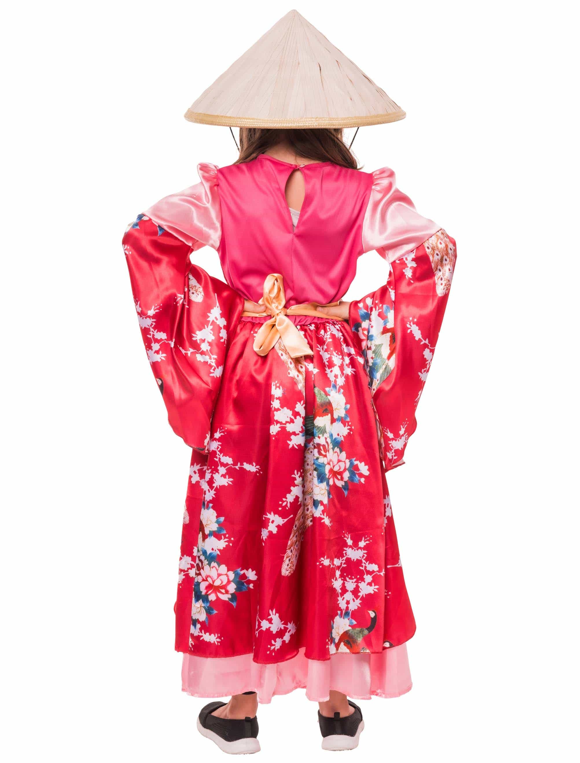 Traditionell, elegant und mit liebevollen Details gestaltet! Unser kunstvoll gestalteter Kimono für Kinder ist ein echter Hingucker für Kostümfeste, Aufführungen oder besondere Anlässe. Der Kimono lässt sich im Nacken bequem mit einem Knopf schließen und ist aus leichtem Material gefertigt, das angenehmen Tragekomfort bietet. Die weiten, fließenden Ärmel unterstreichen den traditionellen Stil. Vorne ist der Kimono offen geschnitten, sodass ein eleganter, langer Rock sichtbar wird, der den klassischen Look perfekt ergänzt. Ideal für kleine Fans fernöstlicher Mode und stilvolle Auftritte mit besonderem Flair!