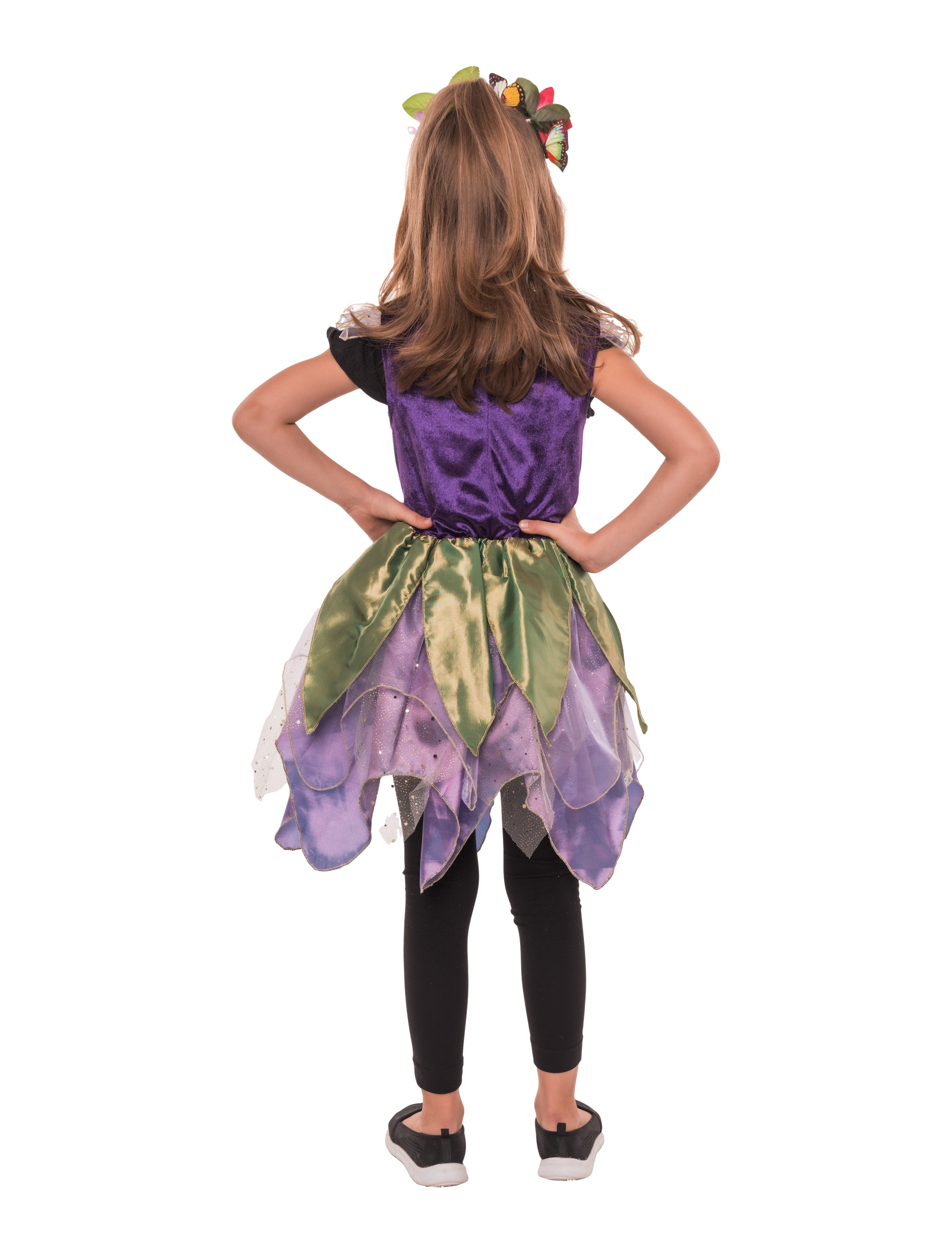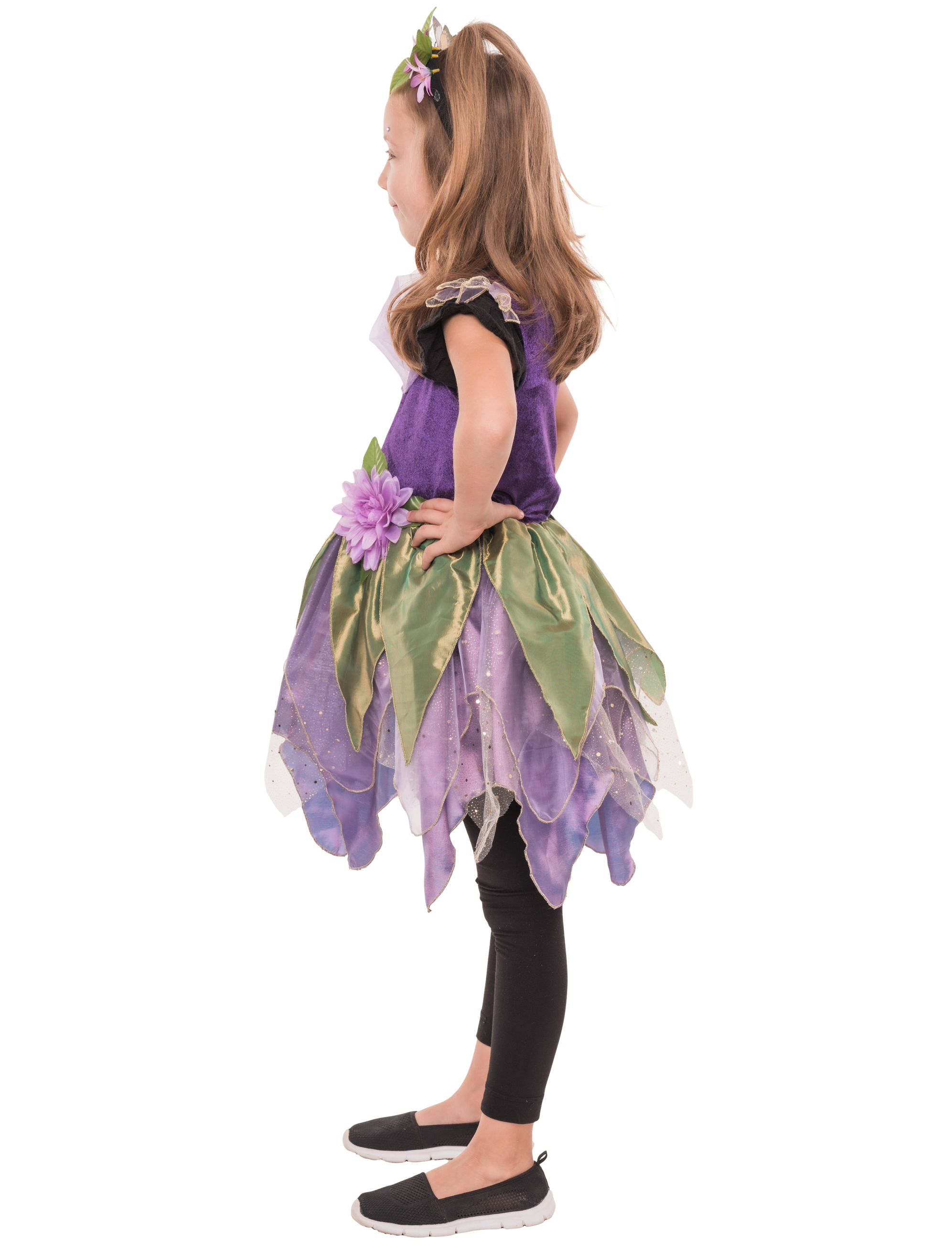 Mit unserem zauberhaften Kleid verwandelst du dich im Handumdrehen in eine kleine Blumenfee! Das Oberteil besteht aus weichem Samt und sorgt für ein angenehmes Tragegefühl. Der mehrschichtige Rock schimmert leicht und erinnert mit seinen Blatt-Elementen an eine Märchenwiese. Eine dekorative Blume an der Taille rundet den magischen Look perfekt ab – ideal für Karneval, Feenpartys oder fantasievolle Kindergeburtstage!