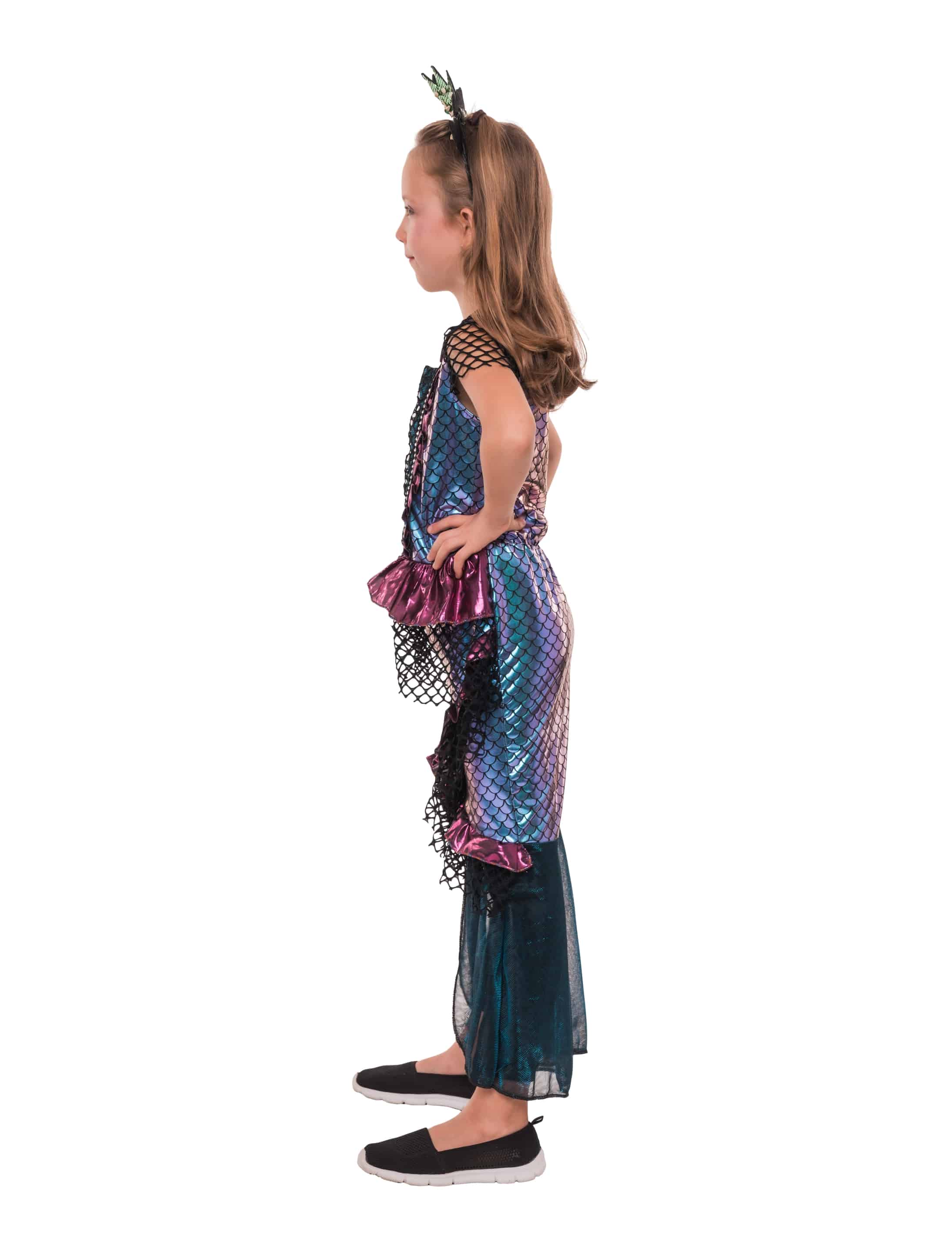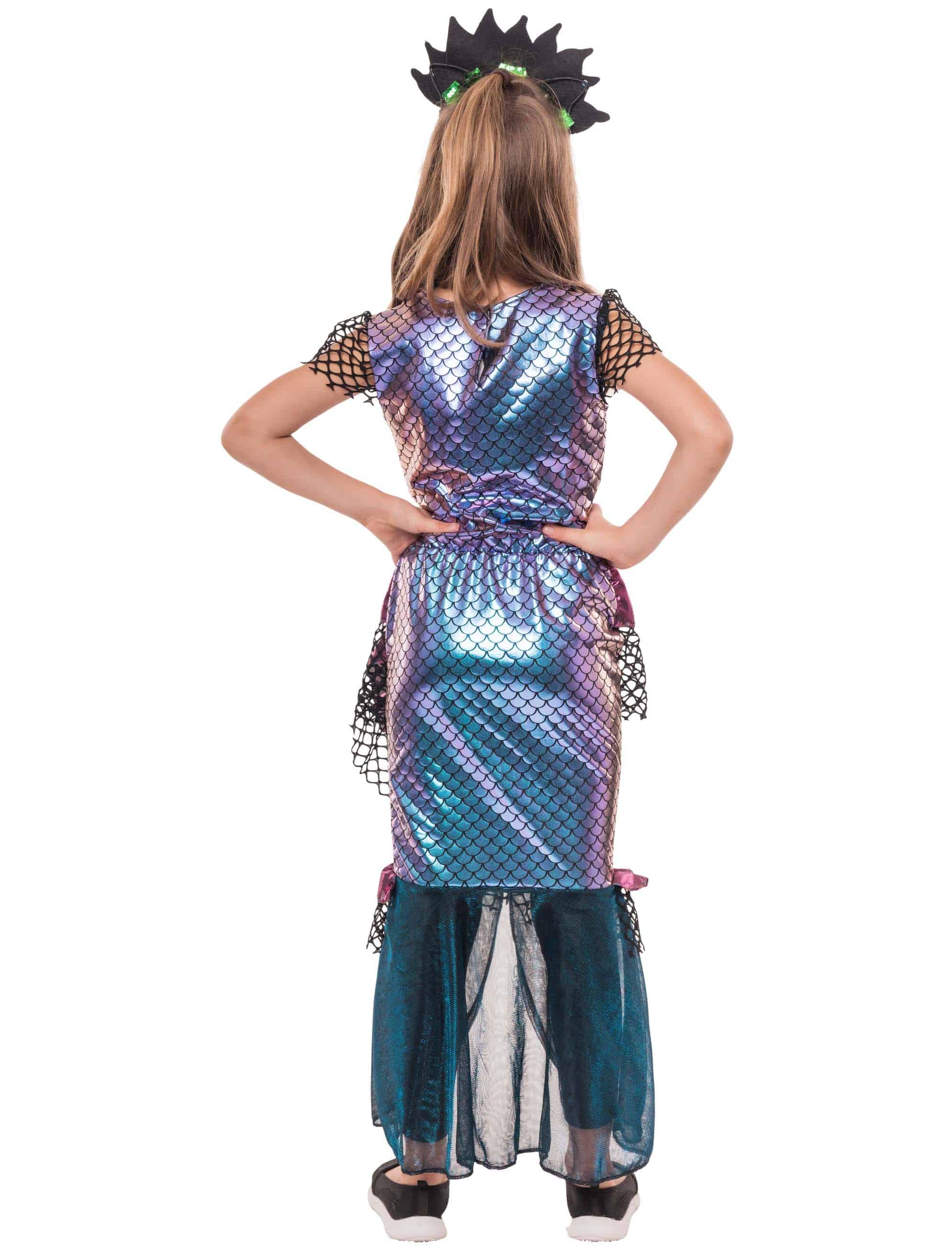 Tauche ein in die zauberhafte Unterwasserwelt mit unserem funkelnden Meerjungfrauen Kleid für Kinder! Das Oberteil ziert ein großer Schmuckstein, der wie ein echter Schatz aus den Tiefen des Meeres glänzt. Der schimmernde Stoff im Fischschuppen-Muster macht dich zur echten Meerjungfrau – glitzernd und geheimnisvoll. Verspielte Netz-Elemente und der glänzende Mesh-Saum sorgen für den perfekten Look. Das Kleid lässt sich am Rücken ganz einfach mit einem Klettverschluss schließen – ideal für kleine Nixen, die blitzschnell in ihr Kostüm schlüpfen wollen. Perfekt für Karneval, Fasching oder Mottopartys!