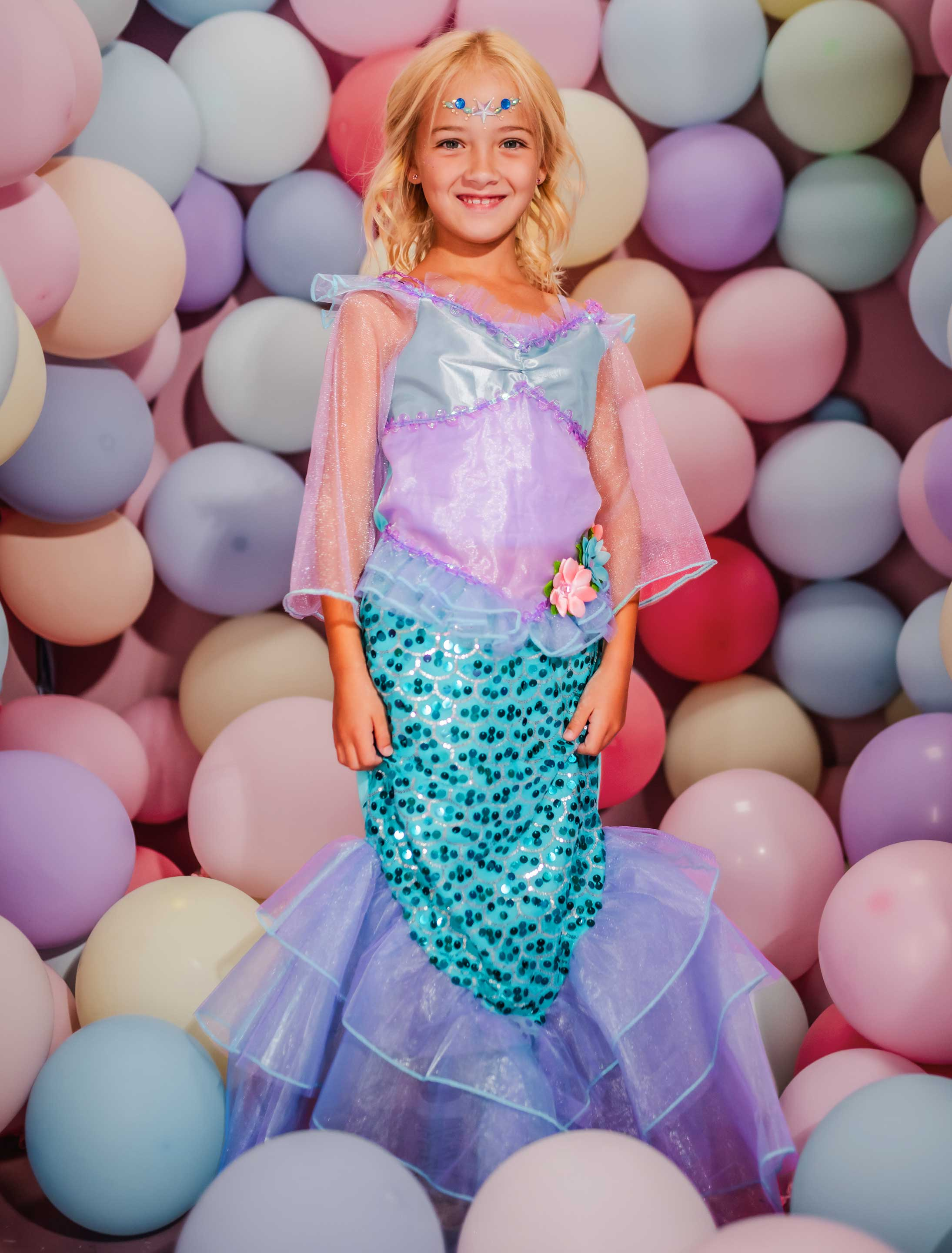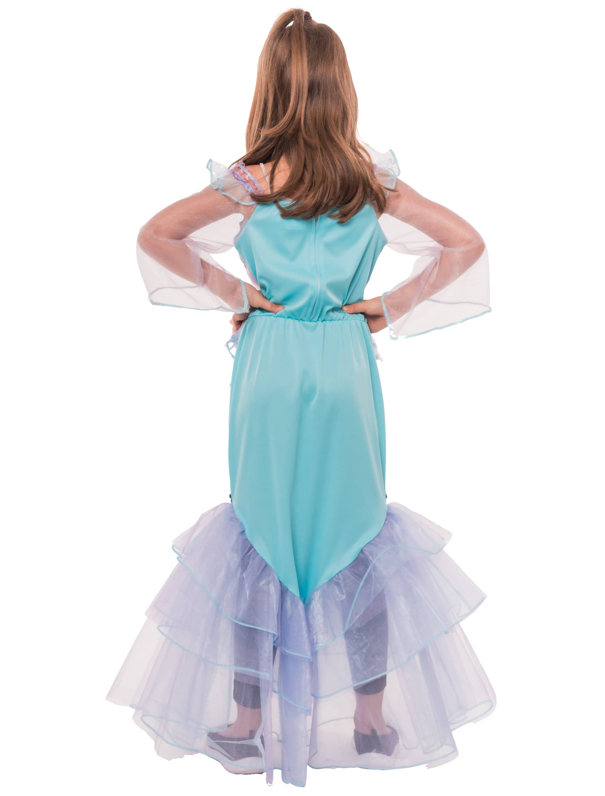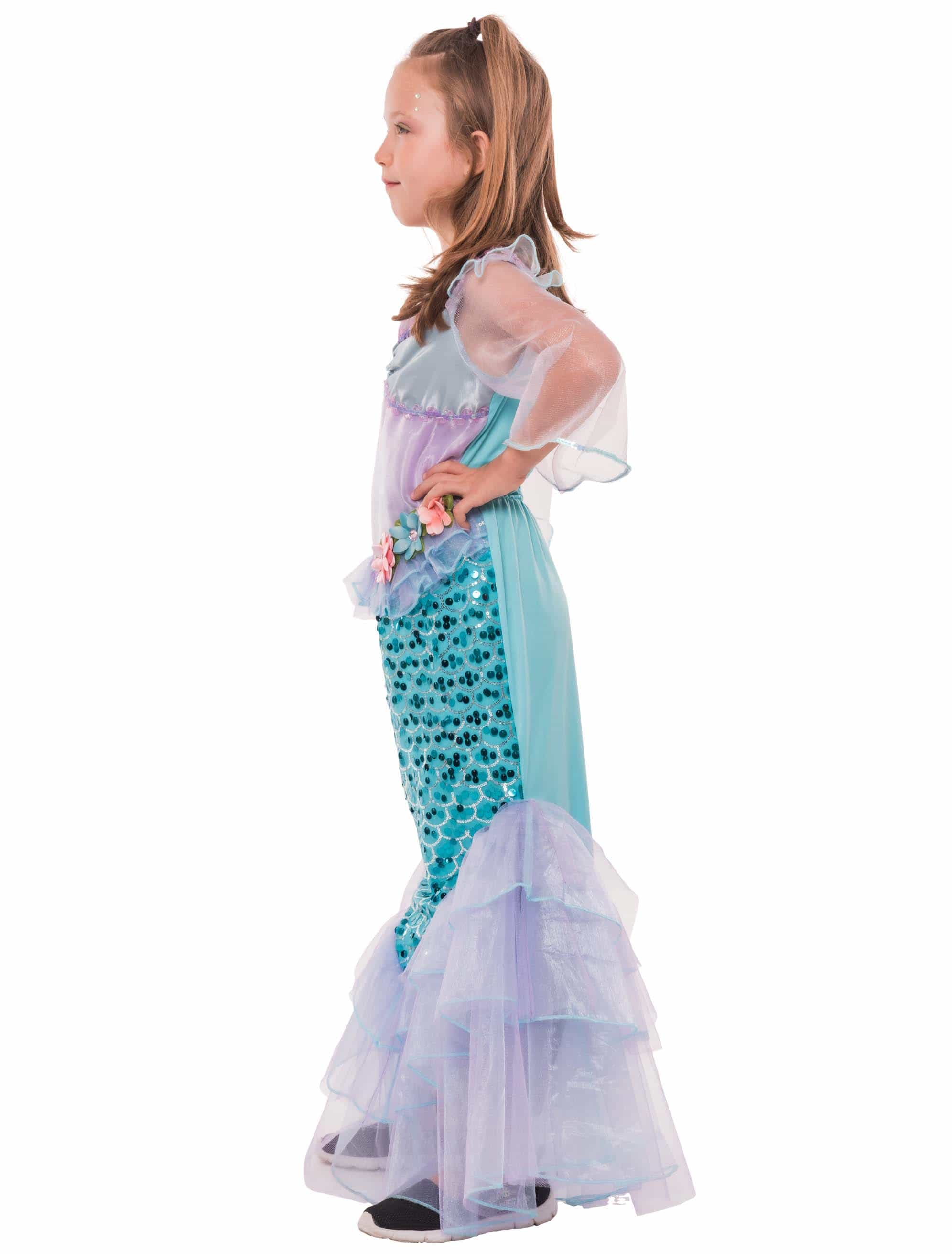 Tauche ein in die zauberhafte Unterwasserwelt mit unserem wunderschönen Meerjungfrauen Kleid für Kinder! Mit seinen vielen liebevollen Details wie kurzen Tüll-Ärmeln, dekorativen Blumen und einem schillernden Pailletten-Rock in Meerjungfrauenform wird dein Auftritt garantiert magisch. Der Tüllsaum rundet das märchenhafte Design perfekt ab. Dank des Reißverschlusses am Rücken lässt sich das Kleid einfach an- und ausziehen – ideal für Karneval, Fasching oder fantasievolle Kindergeburtstage!