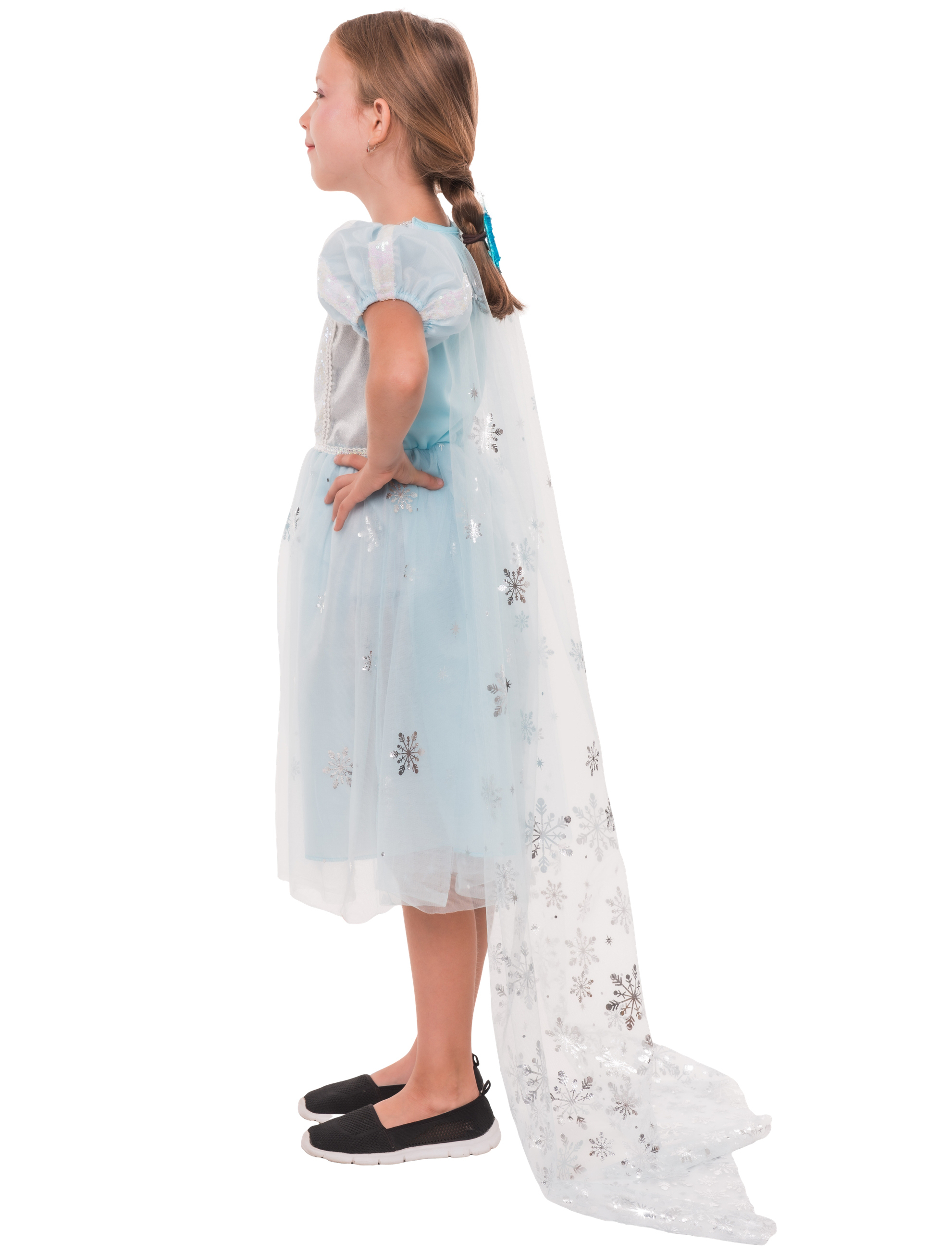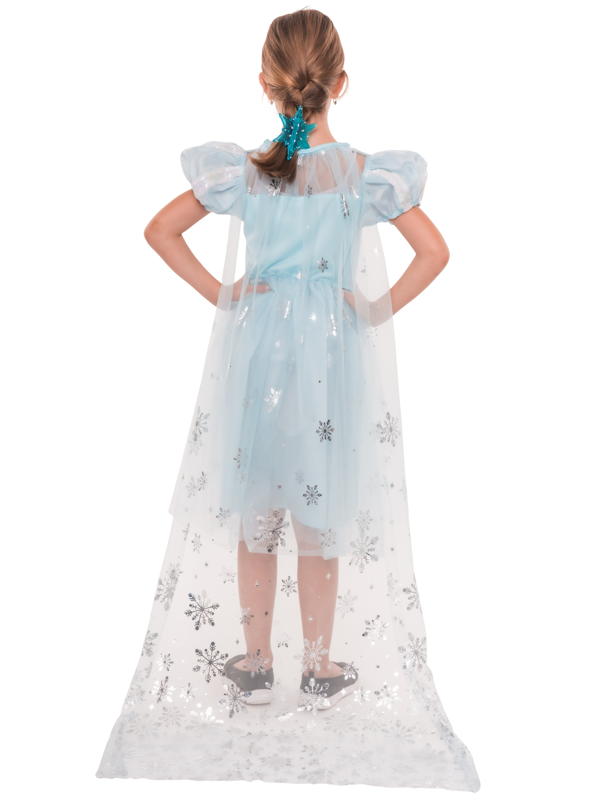 Unser märchenhaftes Schneekönigin Kostüm besteht aus einem eleganten Kleid und einem dazu passenden Cape. Das Cape wird am Rücken des Kleides mit zwei Klettverschlüssen befestigt und besteht aus zartem Tüll, verziert mit funkelnden Schneeflocken und kleinen Sternen. Das Oberteil des Kleides wird von einer auffälligen Brosche geschmückt und besticht durch schimmernde Pailletten sowie glitzernde Elemente. Der Rock greift das Design des Capes auf und sorgt für einen zauberhaften Auftritt. Für einfaches An- und Ausziehen ist das Kleid im Nacken mit einem Klettverschluss versehen. Ideal für kleine Eisprinzessinnen!