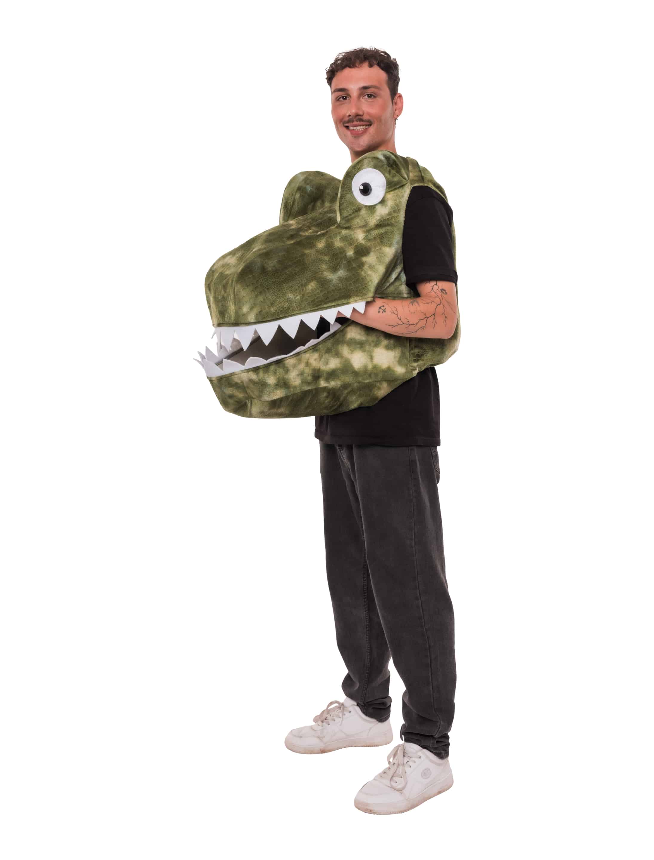 Unser Krokodil Kostüm für Erwachsene sorgt garantiert für Aufsehen – ob auf der nächsten Karnevalsfeier, Motto-Party oder einfach als witziger Hingucker. Du ziehst es bequem über den Kopf, deine Arme schauen seitlich heraus und vor deinem Bauch ragt ein dreidimensionales Krokodilmaul, das du auf- und zuklappen kannst. Dank Klettverschluss am Rücken ist das An- und Ausziehen kinderleicht, auch mitten im Trubel. Die großen, markanten Augen setzen dem tierischen Auftritt die Krone auf.