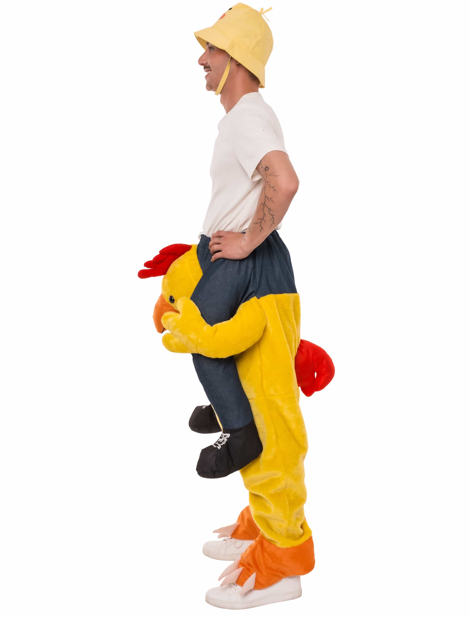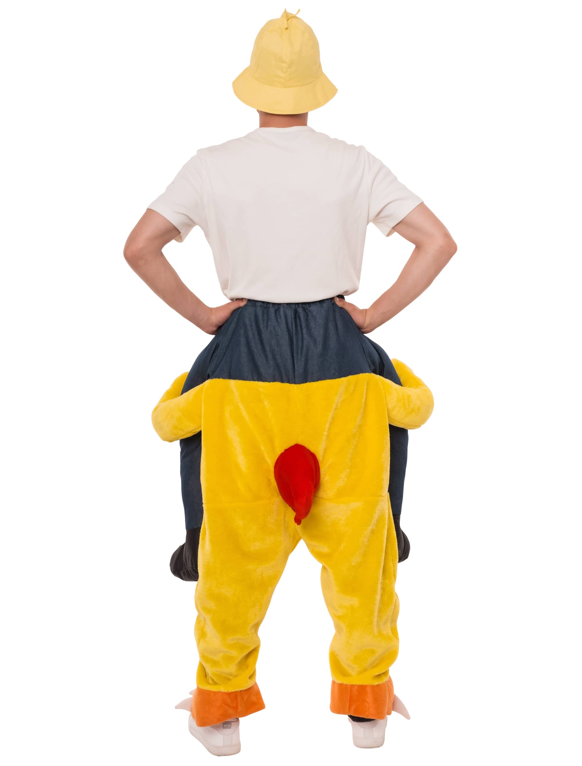 Ab aufs Huhn und los geht's! Unser Plüsch-Huckepack Kostüm für Erwachsene lässt es so aussehen, als würdest du gemütlich auf dem Rücken eines riesigen Huhns reiten. Mit einem Hosenbund zum schnüren, ist die Größe individuell einstellbar und sichert für jeden einen perfekten Halt. Deine tatsächlichen Beine stecken in den Hühnerbeinen und an der Seite hängen deine vermeintlichen "echten Beine" um somit einen täuschend echten Huckepack Look vorzutäuschen. Du kannst das Kostüm einfach über die normale Kleidung anziehen und schon bist du perfekt für Karneval, JGA oder die nächste Mottoparty ausgestattet.