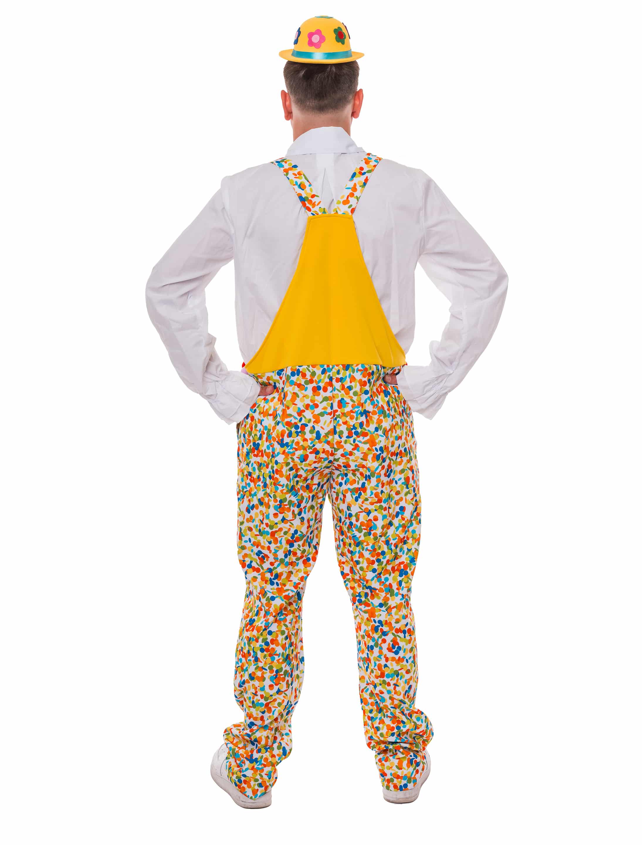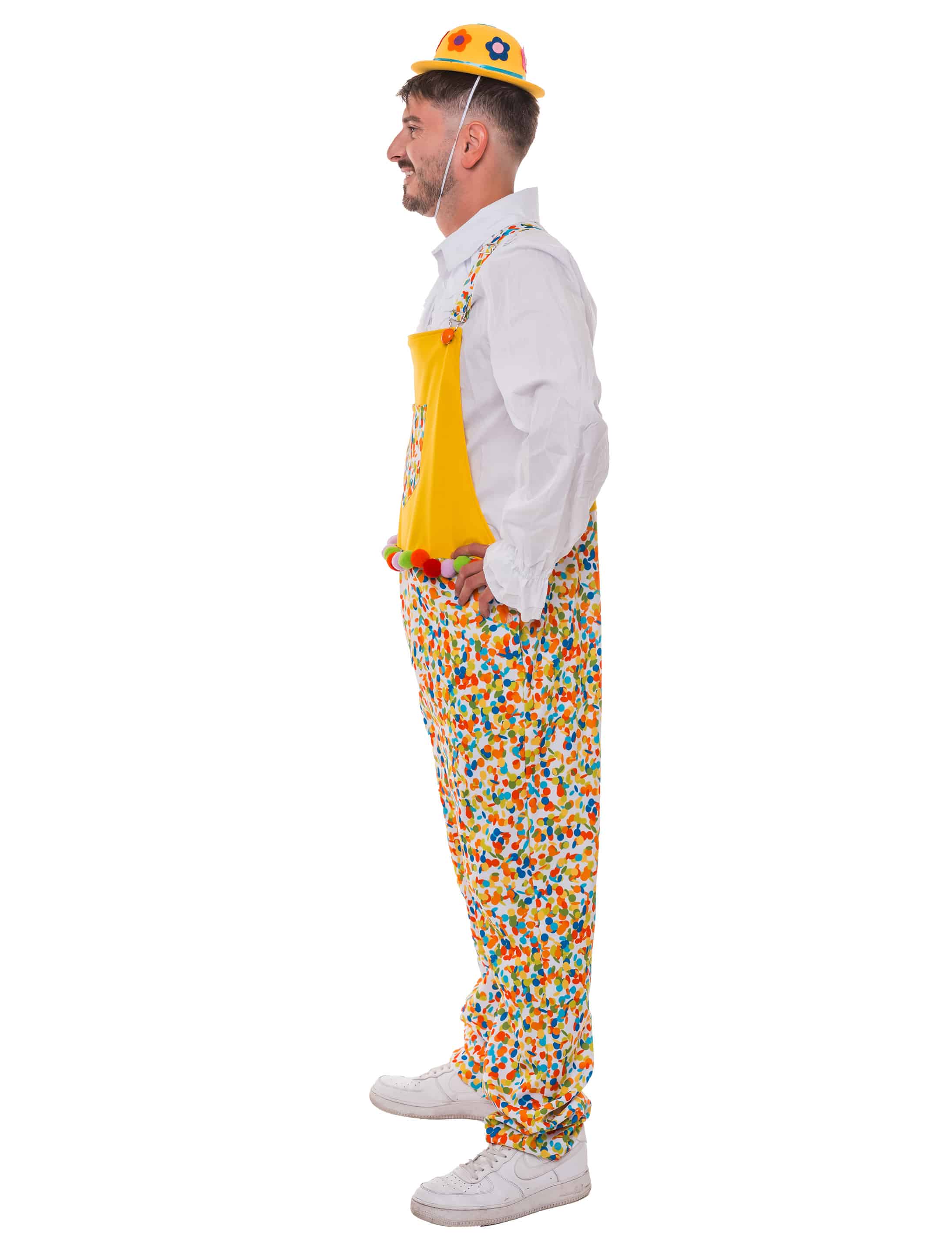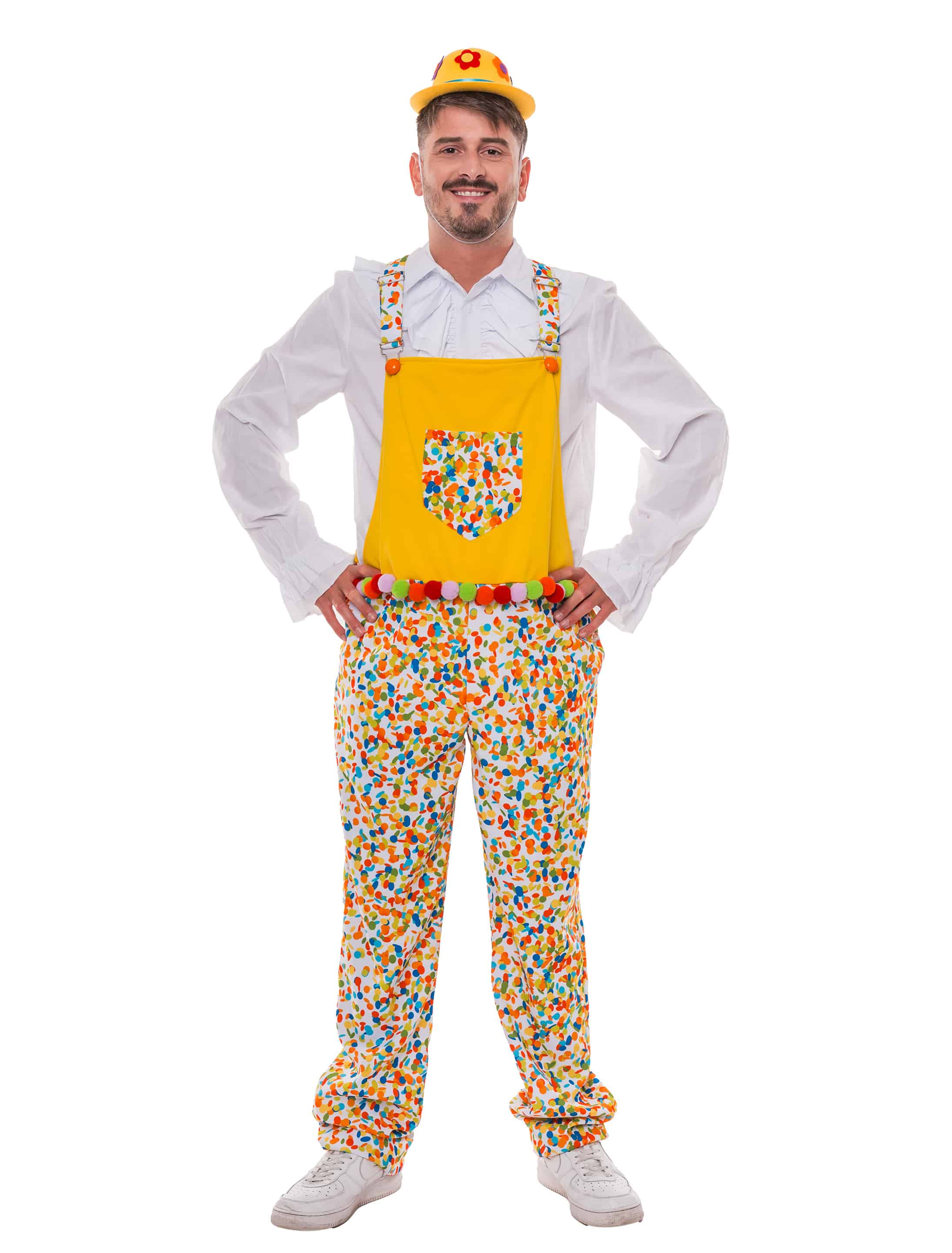 Bereit für deinen großen Auftritt als wandelnde Partykanone? Dann schnapp dir unsere Konfetti Latzhose und bring Stimmung in die Bude! Die mittige Brusttasche eignet sich perfekt für Konfetti Nachschub, während die bunten Bommeln rund um die Hüfte ordentlich Schwung in deine Moves bringen. Die Latzhose lässt sich vorne bequem mit einem Reißverschluss und an den Seiten mit Knöpfen öffnen. Ideal für Karneval, Fasching oder alle, die das Leben am liebsten in Farbe feiern!