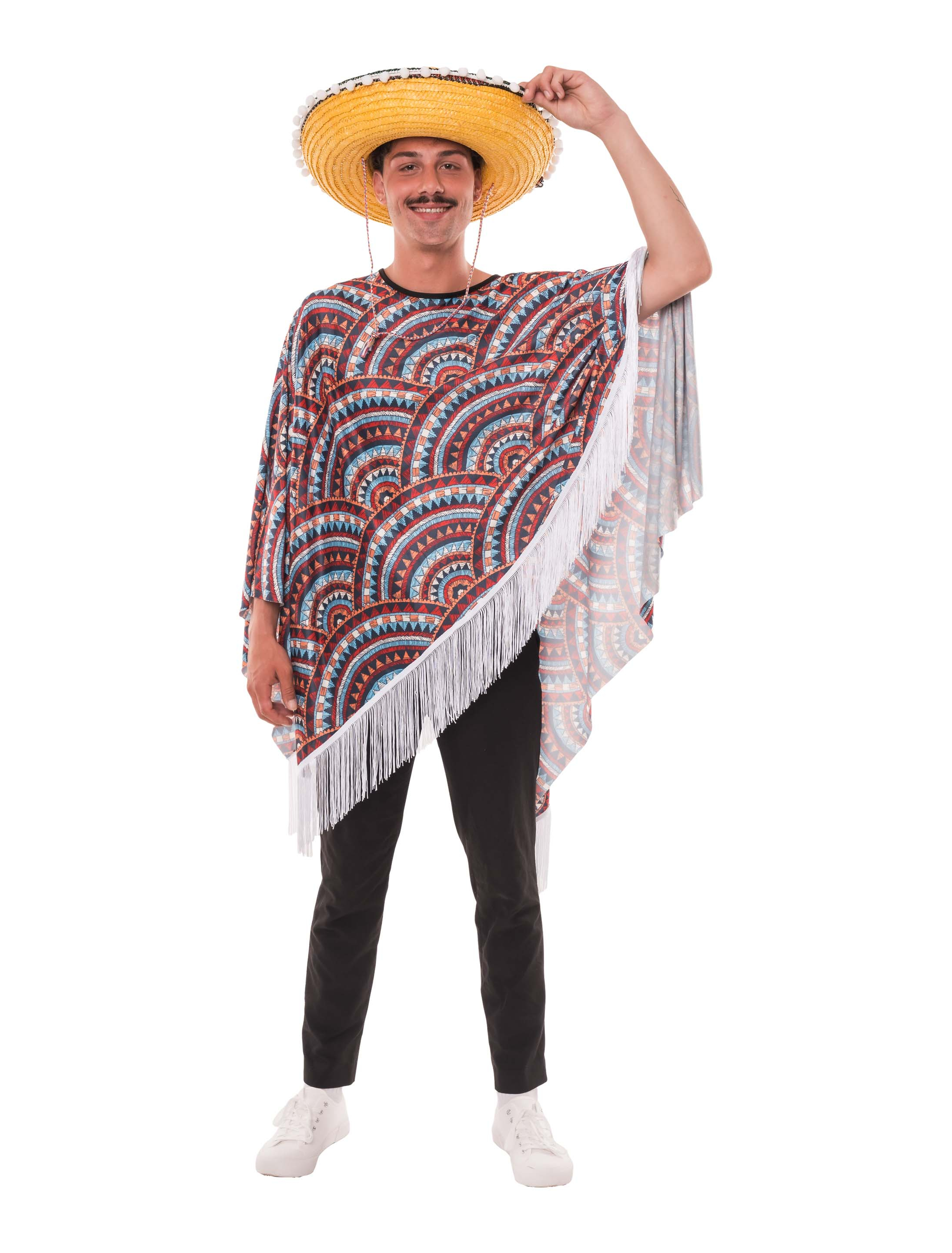 Mit unserem Poncho Fiesta bringst du Farbe, Muster und Bewegung in jedes Kostüm – lebendig, verspielt und mit echtem Festival-Charakter. Das Design überzeugt mit einer Kombination aus verschiedensten Mustern und Strukturen, die dem Poncho einen einzigartigen Look verleihen. Die Fransen am unteren Saum sorgen für zusätzlichen Schwung und machen den Poncho bei jeder Bewegung zum echten Hingucker. Ob über einem schlichten Outfit oder als Teil eines farbenfrohen Kostüms – dieser Poncho passt sich deinem Stil an und sorgt garantiert für Aufsehen. Die bequeme Passform macht ihn zum idealen Begleiter für lange Partynächte, Karnevalsumzüge oder Open-Air-Events!