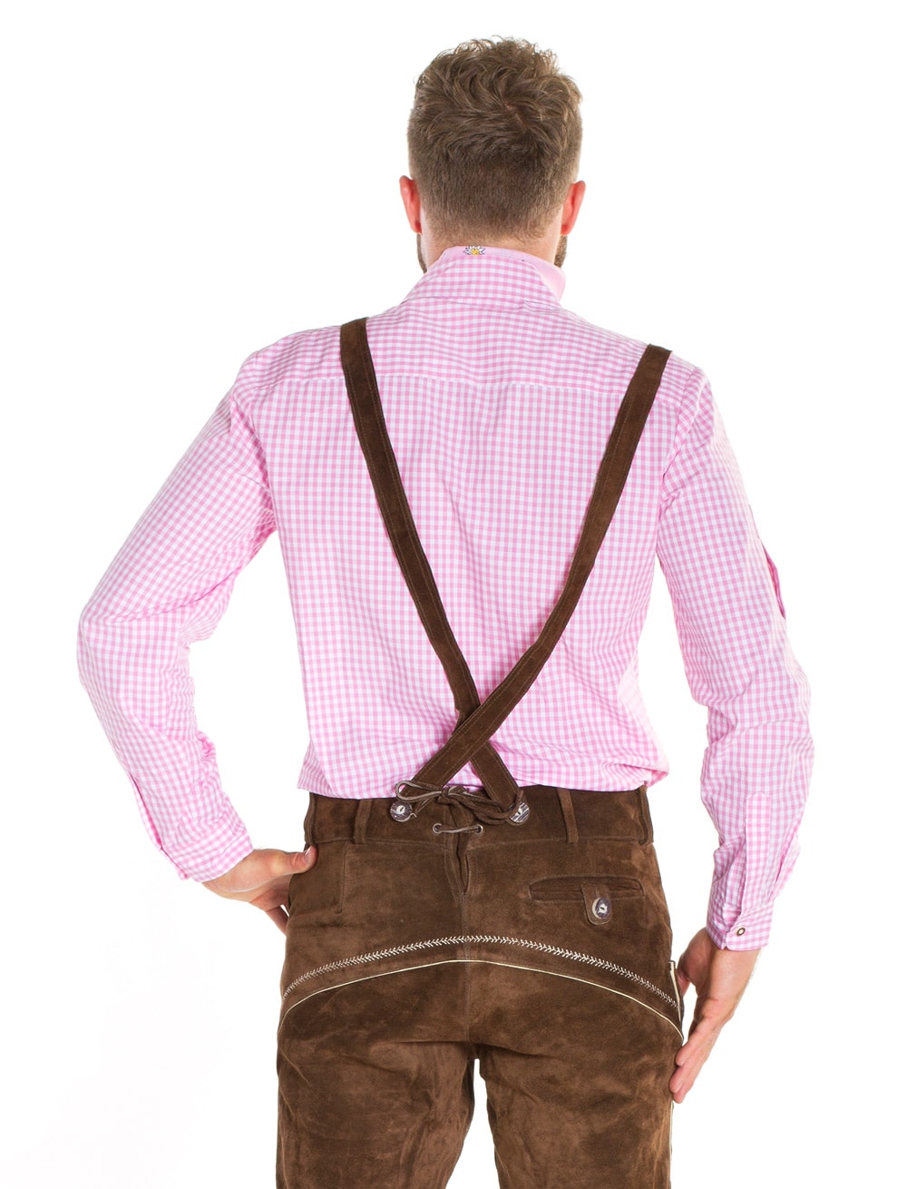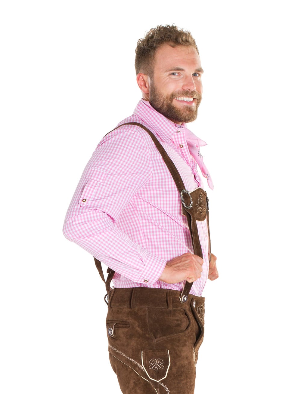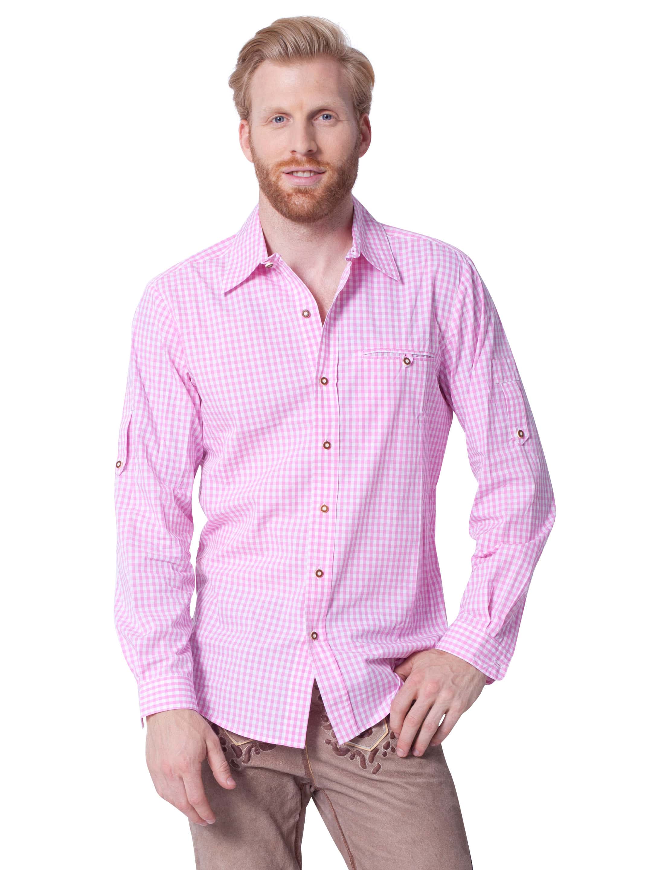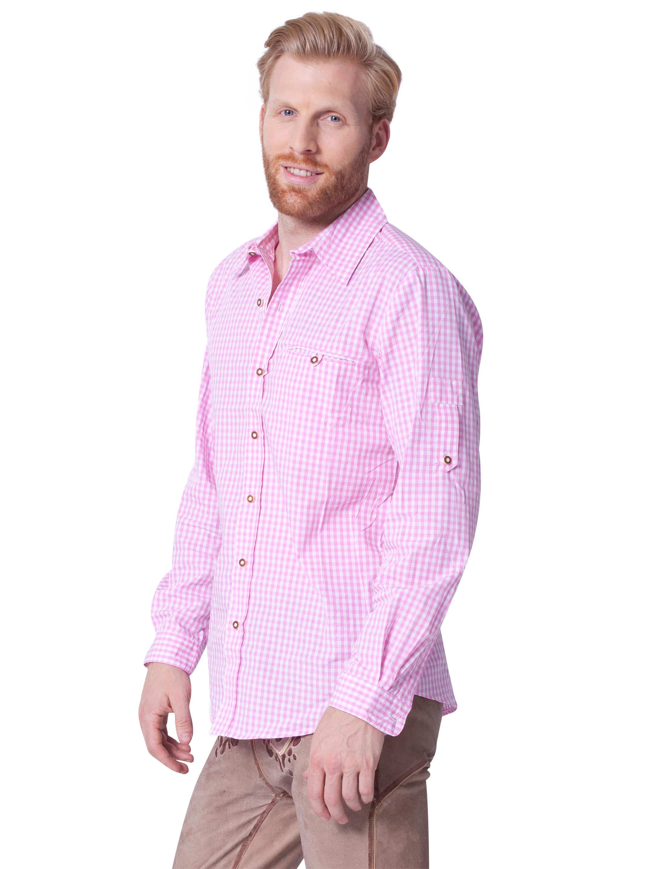 Tradition mit Stil! Das Trachtenhemd in Pink und Weiß ist der ideale Begleiter zu Deiner Lederhose auf dem Trachtenfest oder an Karneval! Das Hemd mit traditionellem Karomuster verleiht Dir maskulinen Stil und Eleganz. Mit einer Knopfleiste aus echten Knöpfen aus Horn lässt sich das Hemd einfach verschließen und öffnen. Eine praktische Brusttasche befindet sich auf der linken Brust. Kocht die Stimmung im Bierzelt so richtig hoch, kannst Du Deine Ärmel ganz einfach und bequem hochkrempeln und mithilfe von Knöpfen und Riegeln befestigen. Das Hemd passt perfekt zu Deiner Lederhose! In Kombination mit ein paar Zubehörteilen perfektionierst Du Deinen bayerischen Look!