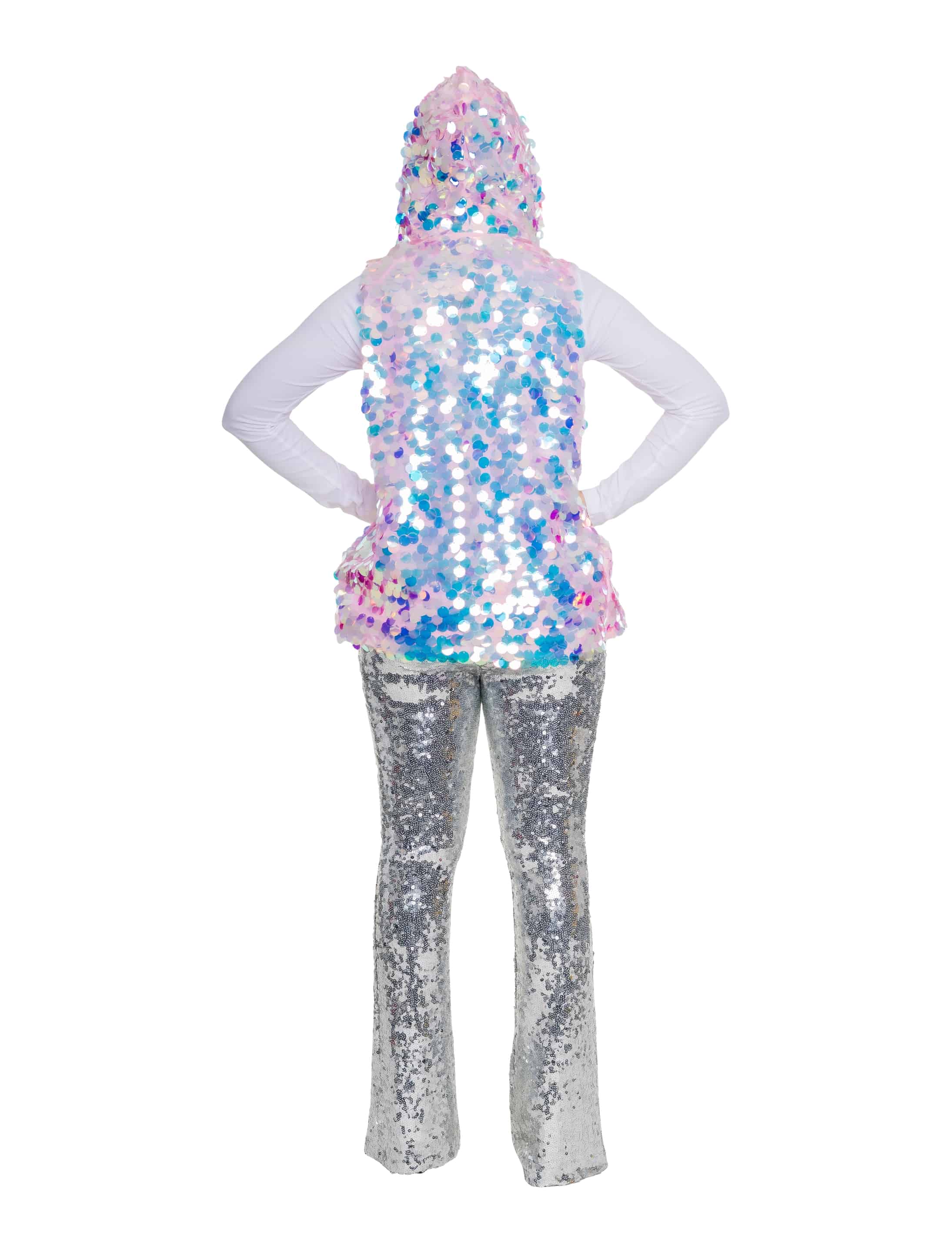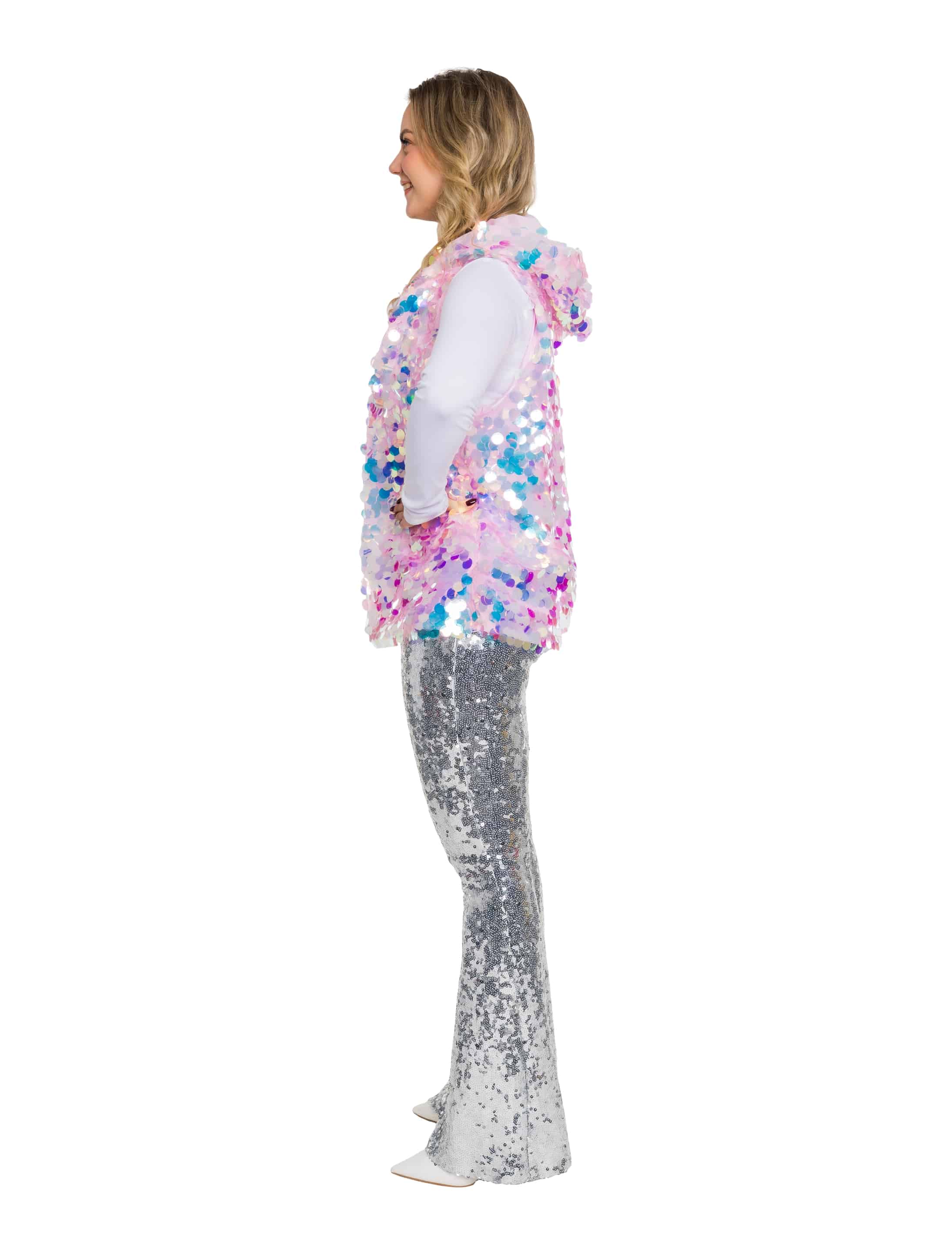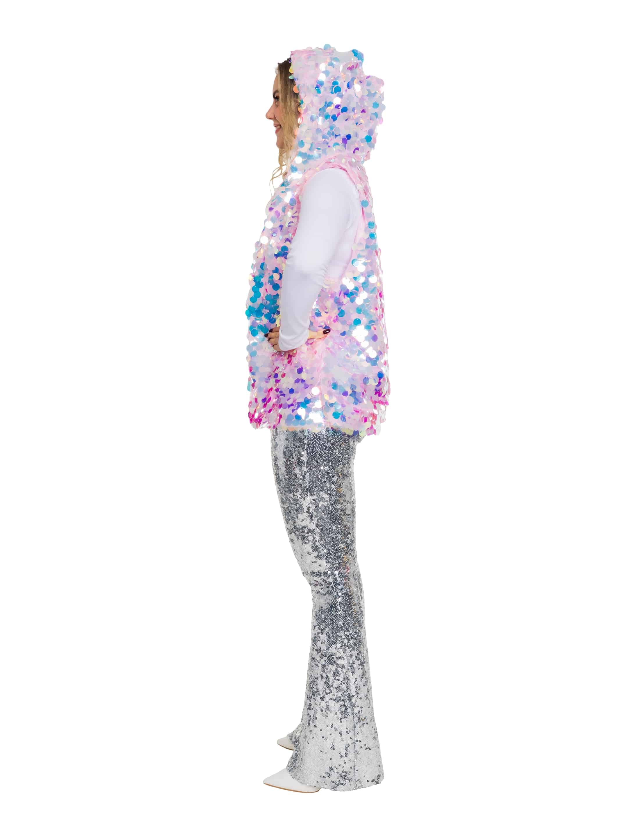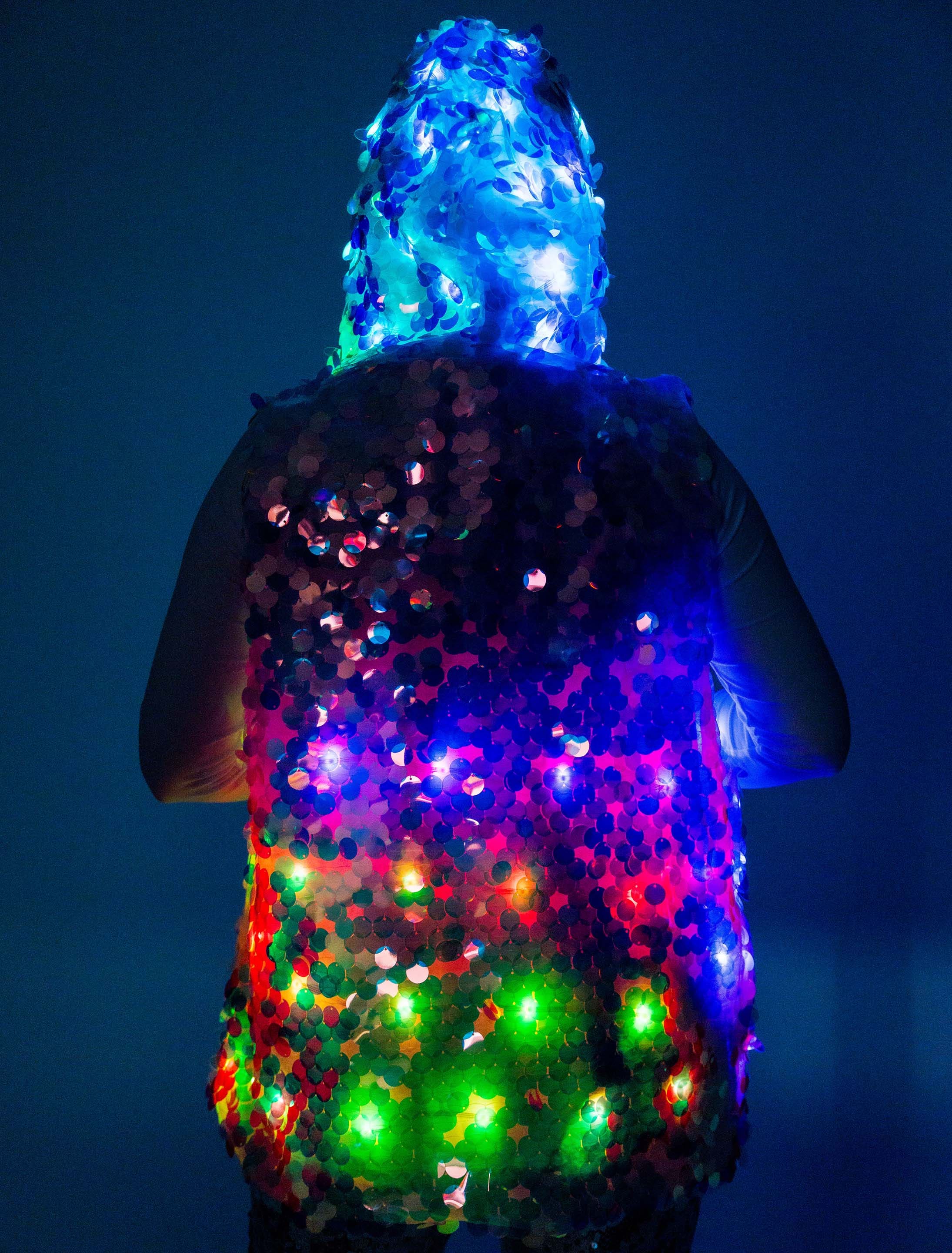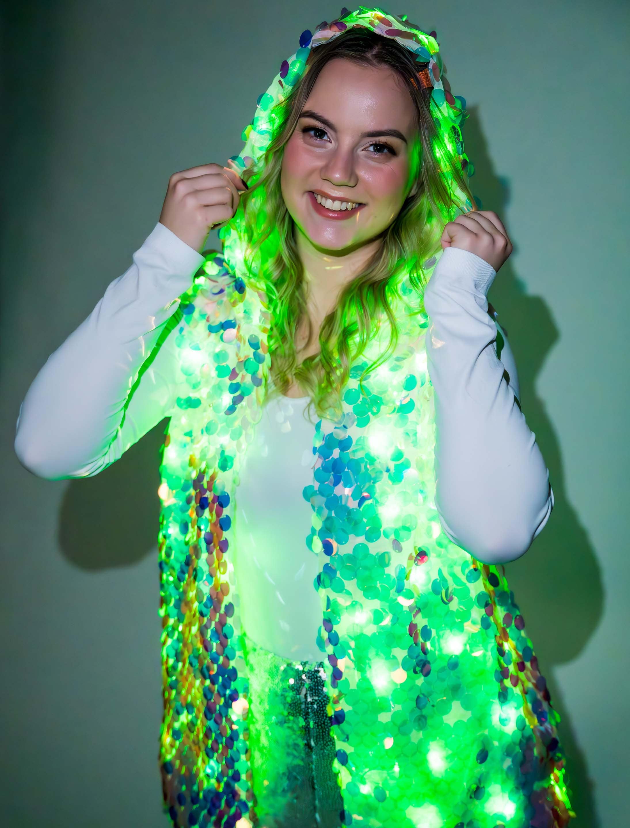Unsere spektakuläre Weste vereint Glamour und Hightech auf beeindruckende Weise! Von oben bis unten funkeln unzählige runde Pailletten und verleihen dem Outfit eine luxuriöse, glitzernde Optik. Die integrierte Kapuze ist ebenso mit funkelnden Pailletten besetzt und rundet das Gesamtbild stilvoll ab. Doch das wahre Highlight versteckt sich im Inneren: Mehrere LEDs, welche in vielen verschiedenen Modi leuchten können, sind dezent in die Weste eingearbeitet und lassen sie bei Dunkelheit in faszinierendem Licht erstrahlen. So wird jede Bewegung zum strahlenden Spektakel!Praktische Taschen auf beiden Seiten bieten zudem Platz für kleine Essentials. Diese Weste ist das perfekte Statement-Piece für alle, die bei Partys, Festivals oder besonderen Anlässen im Mittelpunkt stehen wollen!