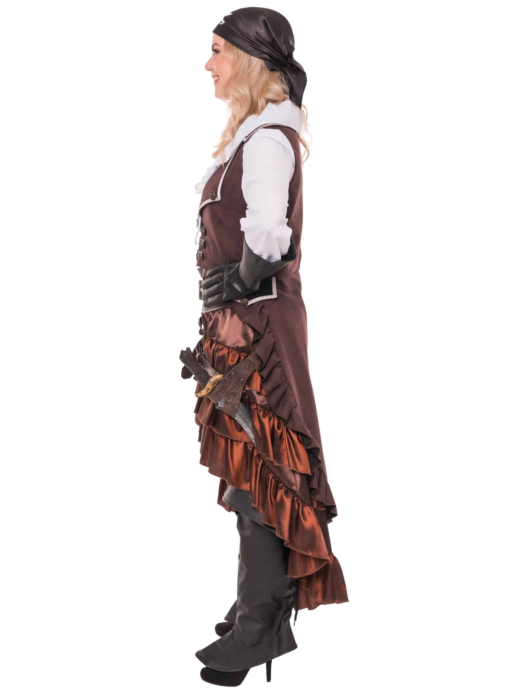 Unsere Weste Piratin ist das perfekte Kleidungsstück für einen eleganten und zugleich abenteuerlichen Piraten-Look! Die Weste lässt sich vorne mit einem Reißverschluss schließen und ist mit mehreren dekorativen Knöpfen verziert, die ihr einen edlen Touch verleihen. Das Highlight ist die verlängerte Rückseite im Frack-Stil, die den Look besonders raffiniert macht und für einen beeindruckenden Auftritt sorgt. Ideal für Karneval, Mottopartys oder Theaterauftritte – mit unserer Piratenweste segelst du stilvoll in jedes Abenteuer!