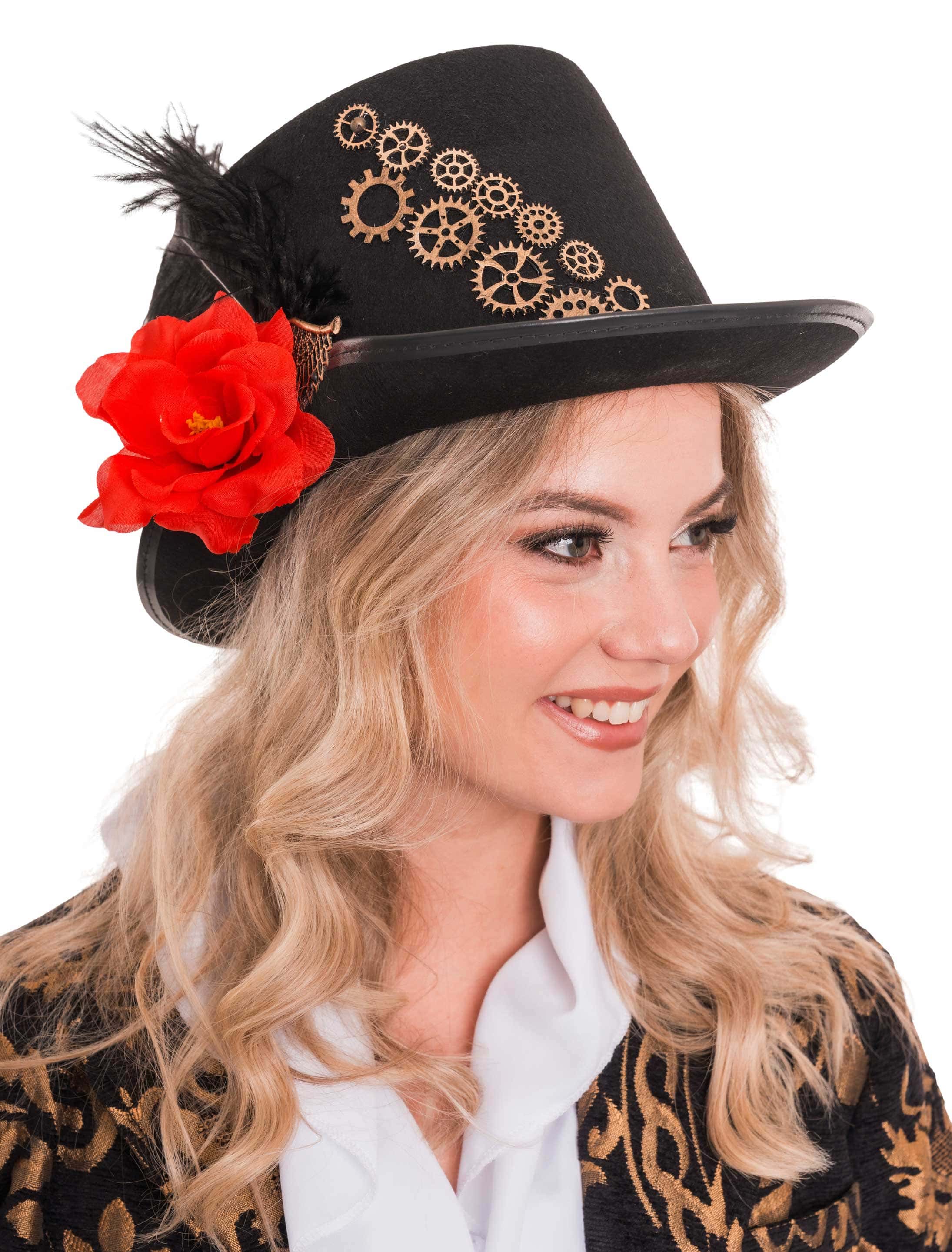 Zylinder mit Zahnrädern, Federn und Blume schwarz 59